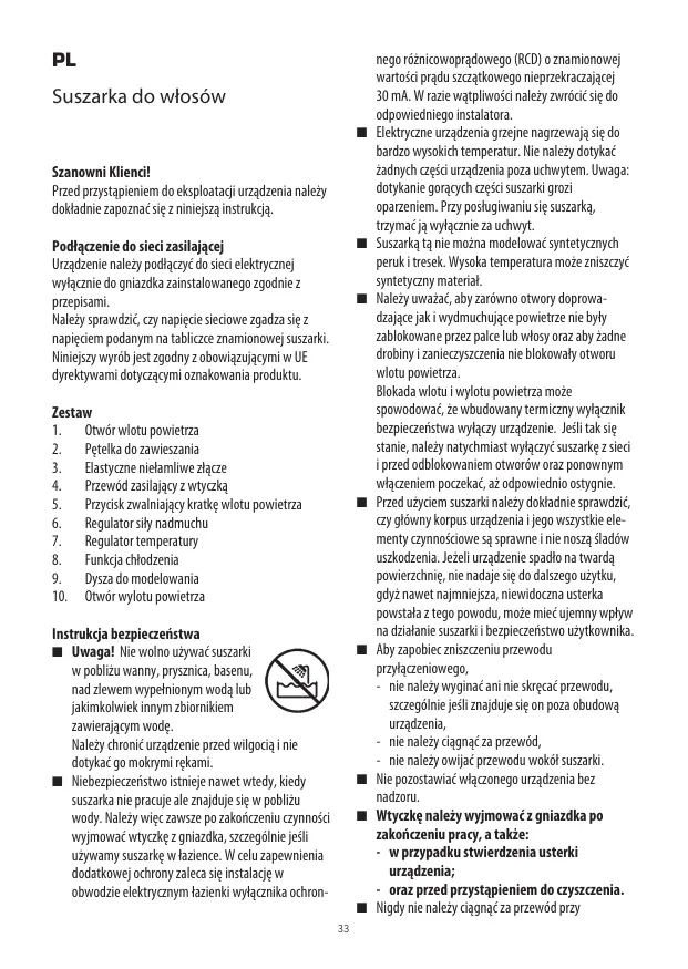 Instruk ga bezpiecesistwa 1 Uwaga! Ne oino uywasuszarki wpoblièu wanny, prysanic, basenu, rad zlewem ypelnionym wod lub akimkohwiek inmym zbionikiem zawierajgcym ode. Naleiy chroniéurzadzenie przed wilgocgi nie dotyhaé go mokrymi rgkami. Niebezpieczeñstwo istnieje navet utedy, kiedy suszaka nie pracuje ae mnajduje se w pobläu wody. Naley wigc zawsze po zakoñczeniu eaynnaéci wpimowaé wtyeakezgniazdka, szczegéini jeli uyvamy suszarkg w rence. W celu zapewnienia dodatkowej ochrony zaleca sie instalacjew obuodie elektryanym azienki wylgcnika ochron- nego réénicowopradowego (RCD) 0 namionowej warto pradu s2czatkowego nieprzekracajace) 30 mA. W ravie watpliwo$cinaley aréci sig do odpouiedniego instalatora. Elektryane urzadzenia grzeje nagrzewaja sig do bardzo wysokich temperatur. Ni naley dotykaé adnych agé urzgdzenia poza uchwytem. Uwaga: dotykanie garacych agécisuszahi gro oparzeniem. Pr poslugiwaniu ie suszarkg, traymaé ja wylacnie za uchwyt. Suszatka ta nie moëna modelowaé syntetyeanych peruktresek. \Wysoka temperatura mode niszczyé syntetyany material. Naleky uwaaé, by Zardwna otwory doproua- drajace jakiwydmuchujgce pouietrze nie by zablokowane przez pale lb wiosy raz abyadne drobinyizanieczyszczenia ni blokowaly otworu wlotu pouietrza. Blokada wlotuiwylotu powietrza moe spovodowaé e wbudowanytermieny wylgcnik berpieczeñstwra wc urzadzenie. Jelitak sie stanie, aleäy atychmiast wylacayé suszatke ieci iprred odblokovaniem otworôu oraz ponounym wlgceniem pocekaé, a odpouiednio ostygnie. Przed uyciem suszarinaleiy doladnie sprawdié, y gféuny korpus urzadzenia jego wsaystke ele- menty cynnoéciowe sg sprawne nie noszg Sladôw uszkodzenia, Jeñel urzqdzeniespadio a twarda powierzchig, nie nadaje sie do dalszego uiytku, gd nauet najmniejza, niewidocrna usteka postal z tego powodu, moñe mie jemny wphrur na daiaaniesuszaki à bezpieczeñstuo ythoumika, Aby zapobiec miszceniu prewodu prayiaceniouego, = nie naleiy yginaé ani ie skrgcaé prrewodu, srcæegéini jeélizmajduje ie on poza obudowa uradrenis, nie naledy iagnaé za prend, nie naledy owija przevodu wokél suszahi Ni pozostauiaé whqzonego urzadzeniabez nadzonu Wtyake naleiy wyjmowaéz gniazdka po zakoñceniu pracy, a take: = wprzypadku stwierdzenia usterki urzadzenia; -_oraz przed praystapieniem do ayszæeni Aigdy ie naleëy cagnaéza prewéd pra)