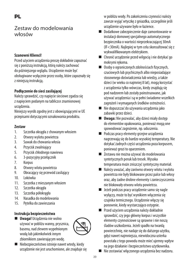 Zestaw do modelowania wloséw Sranowni Kliend! Przed ubyciem urzgdznia prosze dokadnie zapoznaé sie zponitszainstrukj, tr naley zachouaé da péinieiszego wgladu. Urzgdzenie moe byé obstugiwane wylgcaie przez osoby,Ktre zapoznal ie 2 niniejszg instruk. Podacenie do sied zasilajacej Naleysprawdai, y napgci ieciowe 2gadza sig 2 napigciem podanym na tablicze mamionowe) urzdrenis Aiiejzy wyréb zgodnyjestz obowigzujacymi w UE prepisami dotyezgcymi omakowania produktu. Zestaw