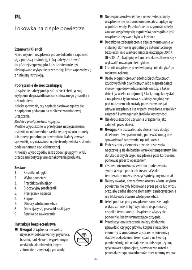 Uwaga! Urzadzenia nie wolno uzywac w oblizu wany, pryszznica, basenu, nad zlewem wypelnionym woda lub jakimkolweyn innym zbiomikiem zwierajacym wode.