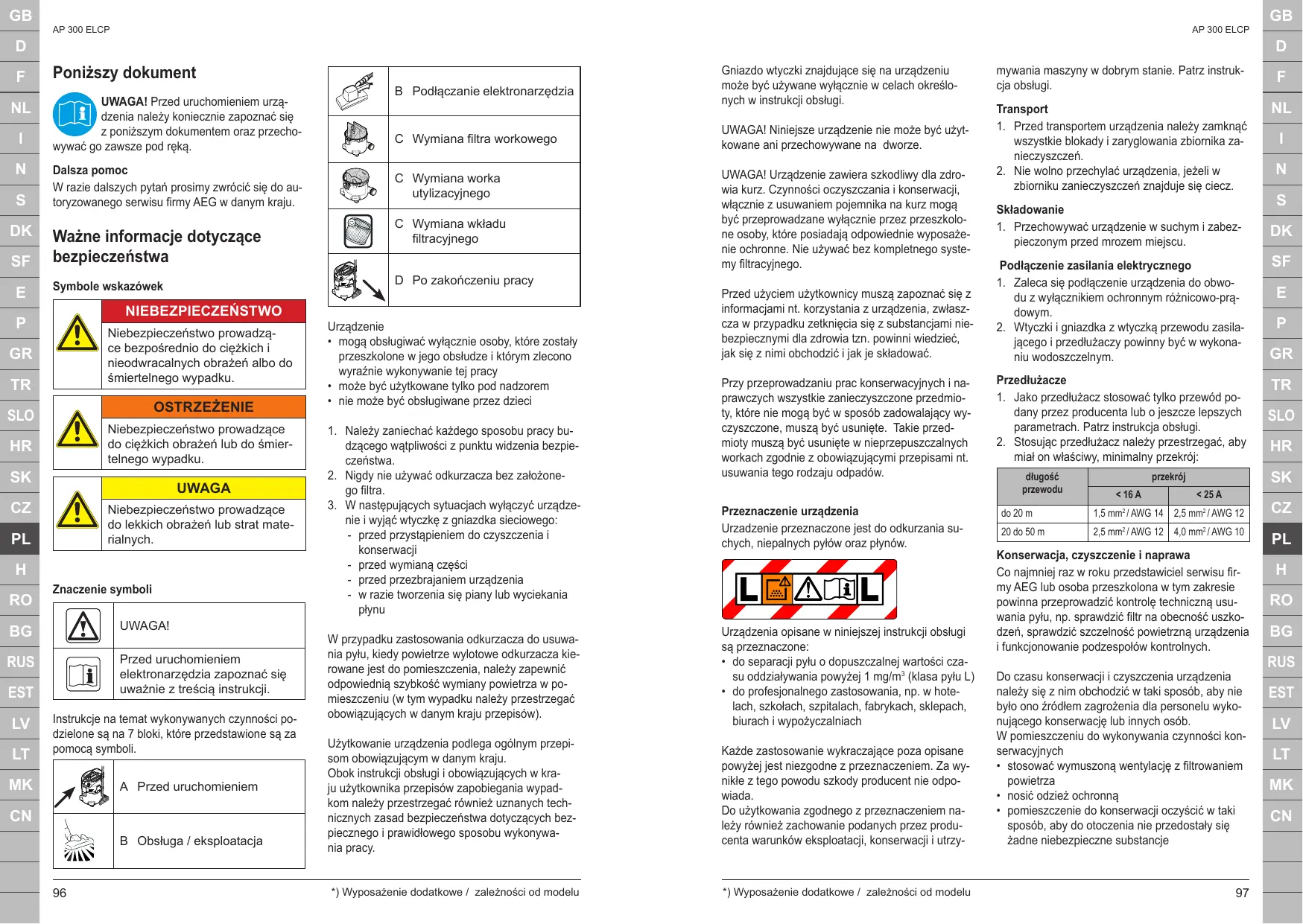 AP 300 ELCP AP 300 ELCP Poniższy dokument UWAGA! Przed uruchomieniem urządzenia należy koniecznie zapoznać się z poniższym dokumentem oraz przechowywać go zawsze pod ręką. Dalsza pomoc W razie dalszych pytań prosimy zwrócić się do autoryzowanego serwisu firmy AEG w danym kraju. Ważne informacje dotyczące bezpieczeństwa NIEBEZPIECZEŃSTWO Niebezpieczeństwo prowadzące bezpośrednio do ciężkich i nieodwracalnych obrażeń albo do śmiertelnego wypadku.