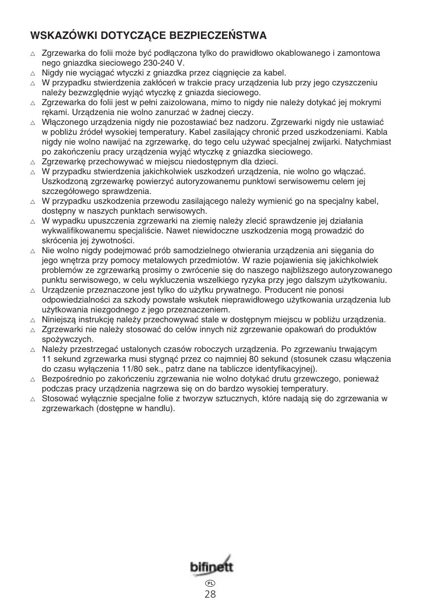 WSKAZÓWKI DOTYCZÑCE BEZPIECZE¡STWA Zgrzewarka do folii mo˝e byç pod∏àczona tylko do prawid∏owo okablowanego i zamontowa nego gniazdka sieciowego 230-240 V. Nigdy nie wyciàgaç wtyczki z gniazdka przez ciàgni´cie za kabel. W przypadku stwierdzenia zak∏óceƒ w trakcie pracy urzàdzenia lub przy jego czyszczeniu nale˝y bezwzgl´dnie wyjàç wtyczk´ z gniazda sieciowego. Zgrzewarka do folii jest w pe∏ni zaizolowana, mimo to nigdy nie nale˝y dotykaç jej mokrymi r´kami. Urzàdzenia nie wolno zanurzaç w ˝adnej cieczy. W∏àczonego urzàdzenia nigdy nie pozostawiaç bez nadzoru. Zgrzewarki nigdy nie ustawiaç w pobli˝u êróde∏ wysokiej temperatury. Kabel zasilajàcy chroniç przed uszkodzeniami. Kabla nigdy nie wolno nawijaç na zgrzewark´, do tego celu u˝ywaç specjalnej zwijarki. Natychmiast po zakoƒczeniu pracy urzàdzenia wyjàç wtyczk´ z gniazdka sieciowego. Zgrzewark´ przechowywaç w miejscu niedost´pnym dla dzieci. W przypadku stwierdzenia jakichkolwiek uszkodzeƒ urzàdzenia, nie wolno go w∏àczaç. Uszkodzonà zgrzewark´ powierzyç autoryzowanemu punktowi serwisowemu celem jej szczegó∏owego sprawdzenia. W przypadku uszkodzenia przewodu zasilajàcego nale˝y wymieniç go na specjalny kabel, dost´pny w naszych punktach serwisowych. W wypadku upuszczenia zgrzewarki na ziemi´ nale˝y zleciç sprawdzenie jej dzia∏ania wykwalifikowanemu specjaliÊcie. Nawet niewidoczne uszkodzenia mogà prowadziç do skrócenia jej ˝ywotnoÊci. Nie wolno nigdy podejmowaç prób samodzielnego otwierania urzàdzenia ani si´gania do jego wn´trza przy pomocy metalowych przedmiotów. W razie pojawienia si´ jakichkolwiek problemów ze zgrzewarkà prosimy o zwrócenie si´ do naszego najbli˝szego autoryzowanego punktu serwisowego, w celu wykluczenia wszelkiego ryzyka przy jego dalszym u˝ytkowaniu. Urzàdzenie przeznaczone jest tylko do u˝ytku prywatnego. Producent nie ponosi odpowiedzialnoÊci za szkody powsta∏e wskutek nieprawid∏owego u˝ytkowania urzàdzenia lub u˝ytkowania niezgodnego z jego przeznaczeniem. Niniejszà instrukcj´ nale˝y przechowywaç stale w dost´pnym miejscu w pobli˝u urzàdzenia. Zgrzewarki nie nale˝y stosowaç do celów innych ni˝ zgrzewanie opakowaƒ do produktów spo˝ywczych. Nale˝y przestrzegaç ustalonych czasów roboczych urzàdzenia. Po zgrzewaniu trwajàcym 11 sekund zgrzewarka musi stygnàç przez co najmniej 80 sekund (stosunek czasu w∏àczenia do czasu wy∏àczenia 11/80 sek., patrz dane na tabliczce identyfikacyjnej). BezpoÊrednio po zakoƒczeniu zgrzewania nie wolno dotykaç drutu grzewczego, poniewa˝ podczas pracy urzàdzenia nagrzewa si´ on do bardzo wysokiej temperatury. Stosowaç wy∏àcznie specjalne folie z tworzyw sztucznych, które nadajà si´ do zgrzewania w zgrzewarkach (dost´pne w handlu).