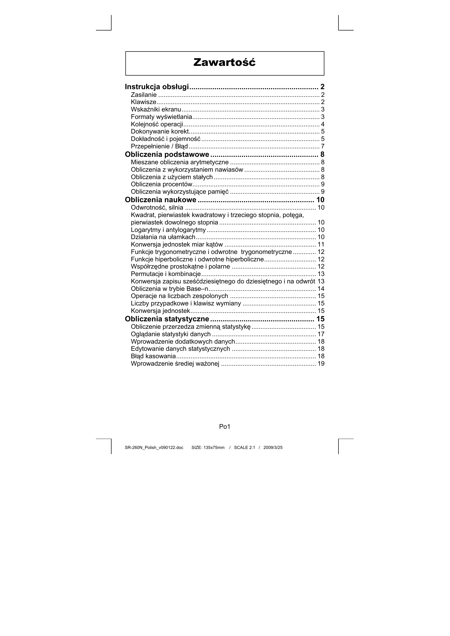 (Uwaga) : Konwersja jednostek z użyciem klawiszy [°F↔°C], [ mmHg↔kpa ], [ gal↔I ], [ lb↔kg ], [ oz↔g ] jest podobna do powyższego przykładu. Obliczenia statystyczne Obliczenie przerzedza zmienną statystykę Aby wejść do trybu obliczeń statystycznych, naciśnij klawisz [ STAT ] ; na ekranie wyświetli się wskaźnik “STAT“. Po15 SR-260N_Polish_v090122.doc SIZE: 135x75mm / SCALE 2:1 / 2009/3/25 W trybie STAT można przeprowadić następujące obliczenia statystyczne z jedną zmienną: liczba wszystkich danych