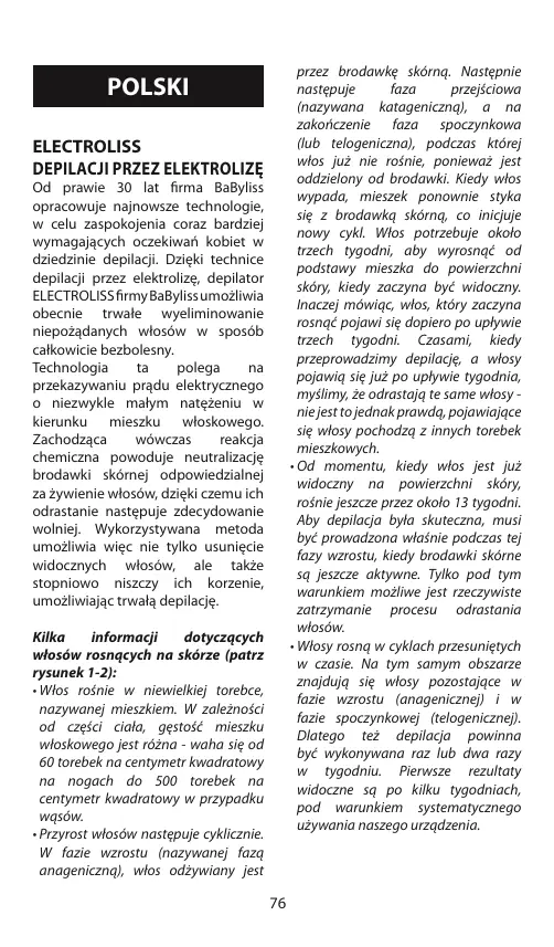 - Włosy rosną w cyklach przesuniętych w czasie. Na tym samym obszarze znajdują się włosy pozostające w fazie wzrostu (anagenicznej) i w fazie spoczynkowej (telogenicznej). Dlatego też depilacja powinna być wykonywana raz lub dwa razy w tygodniu. Pierwsze rezultaty widoczne są po kilku tygodniach, pod warunkiem systematycznego używania naszego urządzenia. POLSKI ELECTROLISS depilacji przez elektrolizę Od prawie 30 lat firma BaByliss opracowuje najnowsze technologie, w celu zaspokojenia coraz bardziej wymagających oczekiwań kobiet w dziedzinie depilacji. Dzięki technice depilacji przez elektrolizę, depilator ELECTROLISS firmy BaByliss umożliwia obecnie trwałe wyeliminowanie niepożądanych włosów w sposób całkowicie bezbolesny. Technologia polega przekazywaniu prądu elektrycznego o niezwykle małym natężeniu w kierunku mieszku włoskowego. Zachodząca wówczas reakcja chemiczna powoduje neutralizację brodawki skórnej odpowiedzialnej za żywienie włosów, dzięki czemu ich odrastanie następuje zdecydowanie wolniej. Wykorzystywana metoda umożliwia więc nie tylko usunięcie widocznych włosów, ale także stopniowo niszczy ich korzenie, umożliwiając trwałą depilację. Kilka informacji dotyczących włosów rosnących na skórze (patrz rysunek 1-2):