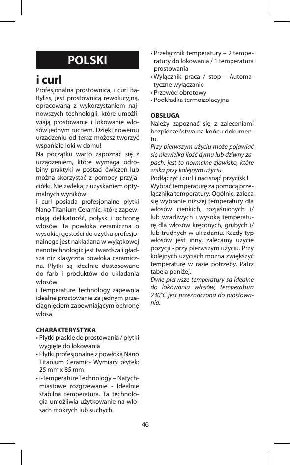 - Podkładka termoizolacyjna polski i curl Profesjonalna prostownica, i curl BaByliss, jest prostownicą rewolucyjną, opracowaną z wykorzystaniem najnowszych technologii, które umożliwiają prostowanie i lokowanie włosów jednym ruchem. Dzięki nowemu urządzeniu od teraz możesz tworzyć wspaniałe loki w domu! Na początku warto zapoznać się z urządzeniem, które wymaga odrobiny praktyki w postaci ćwiczeń lub można skorzystać z pomocy przyjaciółki. Nie zwlekaj z uzyskaniem optymalnych wyników! i curl posiada profesjonalne płytki Nano Titanium Ceramic, które zapewniają delikatność, połysk i ochronę włosów. Ta powłoka ceramiczna o wysokiej gęstości do użytku profesjonalnego jest nakładana w wyjątkowej nanotechnologii: jest twardsza i gładsza niż klasyczna powłoka ceramiczna. Płytki są idealnie dostosowane do farb i produktów do układania włosów. i Temperature Technology zapewnia idealne prostowanie za jednym przeciągnięciem zapewniającym ochronę włosa. OBSŁUGA Należy zapoznać się z zaleceniami bezpieczeństwa na końcu dokumentu. Przy pierwszym użyciu może pojawiać się niewielka ilość dymu lub dziwny zapach: jest to normalne zjawisko, które znika przy kolejnym użyciu. Podłączyć i curl i nacisnąć przycisk I. Wybrać temperaturę za pomocą przełącznika temperatury. Ogólnie, zaleca się wybranie niższej temperatury dla włosów cienkich, rozjaśnionych i/ lub wrażliwych i wysoką temperaturę dla włosów kręconych, grubych i/ lub trudnych w układaniu. Każdy typ włosów jest inny, zalecamy użycie pozycji • przy pierwszym użyciu. Przy kolejnych użyciach można zwiększyć temperaturę w razie potrzeby. Patrz tabela poniżej. Dwie pierwsze temperatury są idealne do lokowania włosów, temperatura 230°C jest przeznaczona do prostowania. CHARAKTERYSTYKA
