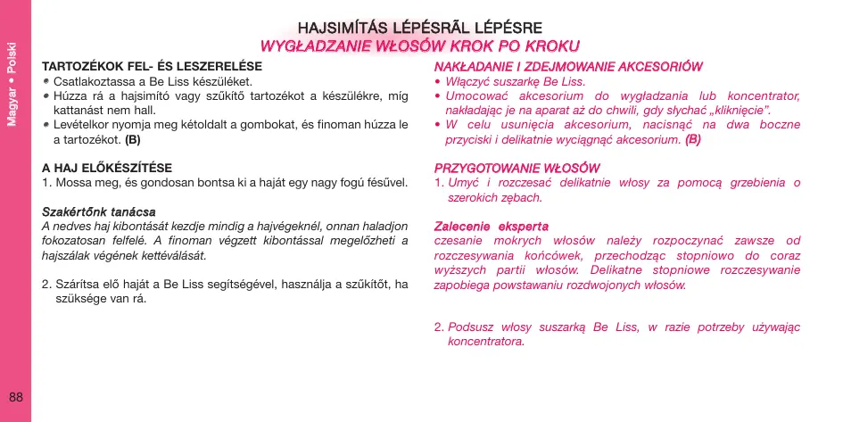 2. Separate una ciocca di capelli di circa 5 cm di larghezza. Tenete il pettine Be Liss per sciogliere i nodi verso il basso, posizionandolo alla cute e controllando che i denti del pettine per sciogliere i nodi penetrino bene fra i capelli. ( D ) 3. Con un leggero movimento del polso verso l’interno, fate scorrere l’apparecchio su tutta la lunghezza del capello: l’azione dei pettini mobili liscianti in Metal-Ceramic è così potenziata al massimo. ( E ) 4. Per finire, fissate la piega con un colpo di aria fredda, per un risultato a lunga tenuta. 3. Realizando un ligero movimiento con el puño hacia el interior, deslice el aparato lentamente a lo largo de todo el cabello: de este modo, obtendrá una acción óptima de los peines alisadores móviles MetalCeramic. ( E ) 4.Termine con un chorro de aire frío para fijar el peinado con un efecto de larga duración.