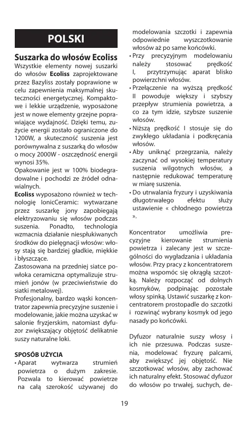 Koncentrator umożliwia precyzyjne kierowanie strumienia powietrza i zalecany jest w szczególności do wygładzania i układania włosów. Przy pracy z koncentratorem można wspomóc się okrągłą szczotką. Należy rozpocząć od dolnych kosmyków, podpinając pozostałe włosy spinką. Ustawić suszarkę z koncentratorem prostopadle do szczotki i rozwinąć wybrany kosmyk od jego nasady po końcówki. Dyfuzor naturalnie suszy włosy i ich nie przesuwa. Podczas suszenia, modelować fryzurę palcami, aby zwiększyć jej objętość. Nie szczotkować włosów, aby zachować ich naturalny efekt. Stosować dyfuzor do włosów po trwałej, suchych, de-