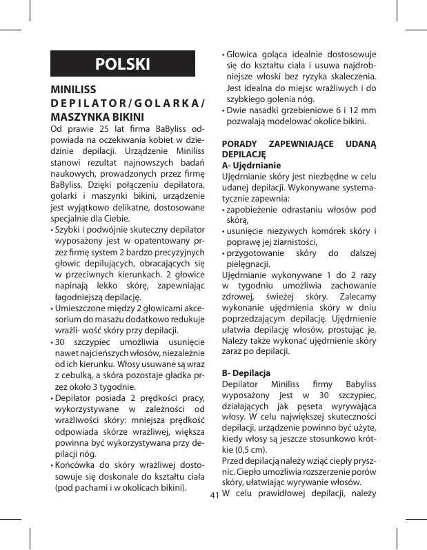 + Depilator Miniliss_ firmy BaByliss pou nien byé uywany jedynie do depilacj, przestrzegajac zalecerñ niniejszej ins- trukcj obstugi.