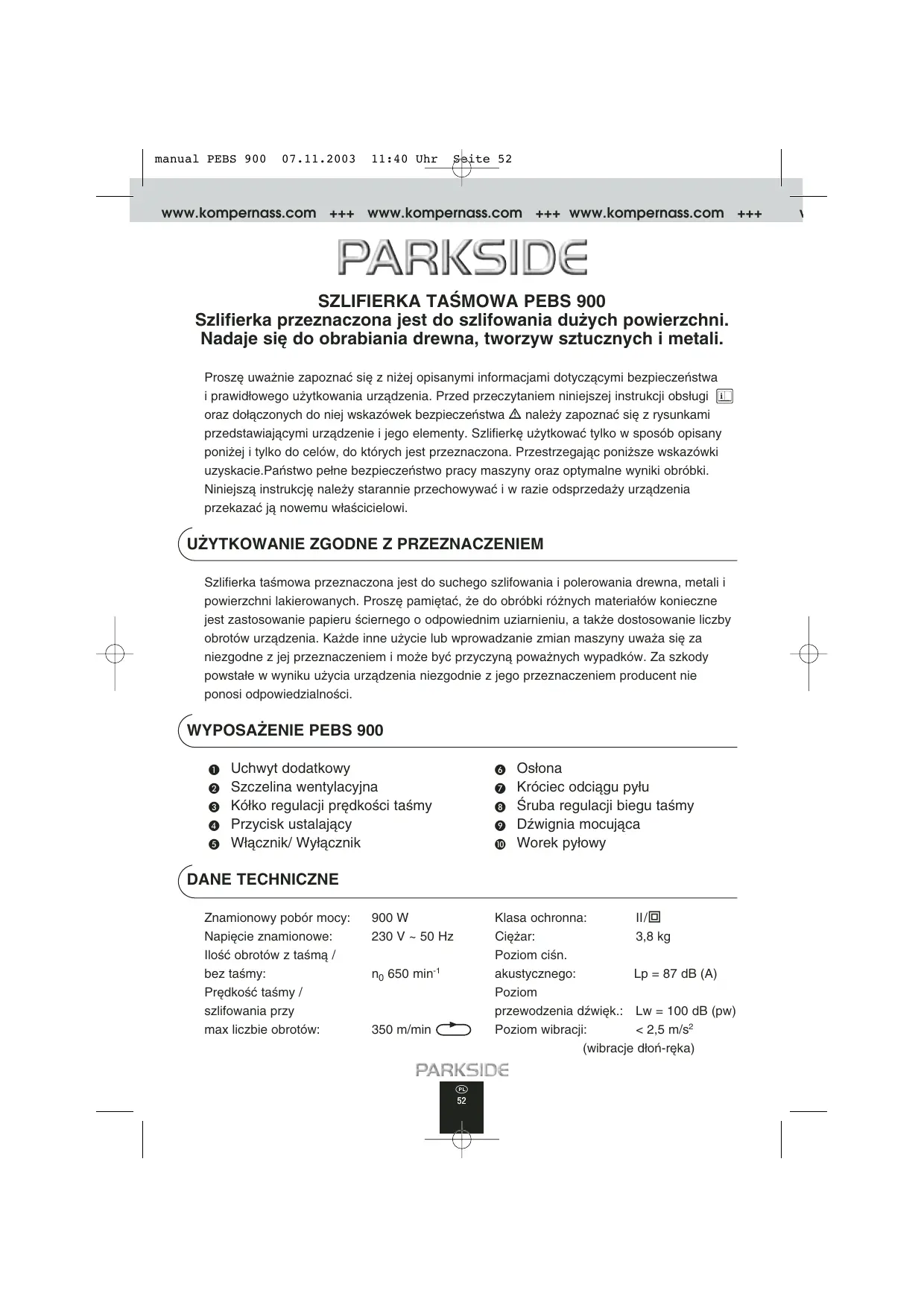 KH 3115 BELT SANDER - Szlifierka taśmowa PARKSIDE - Bezpłatna instrukcja obsługi