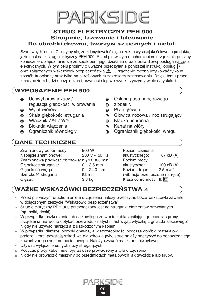 PEH 900 - Strug elektryczny PARKSIDE - Bezpłatna instrukcja obsługi