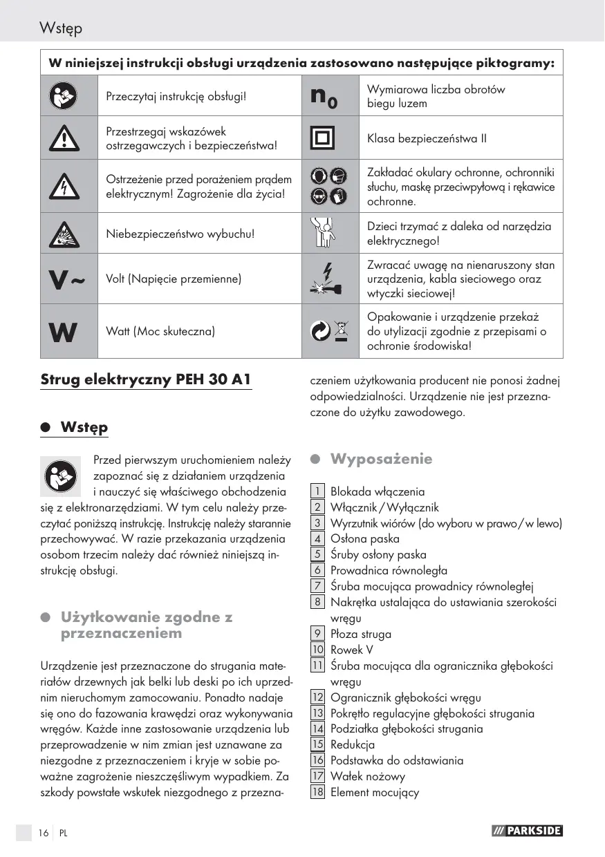 PEH 30 A1 ELECTRIC PLANER - Narzędzie elektryczne PARKSIDE - Bezpłatna instrukcja obsługi