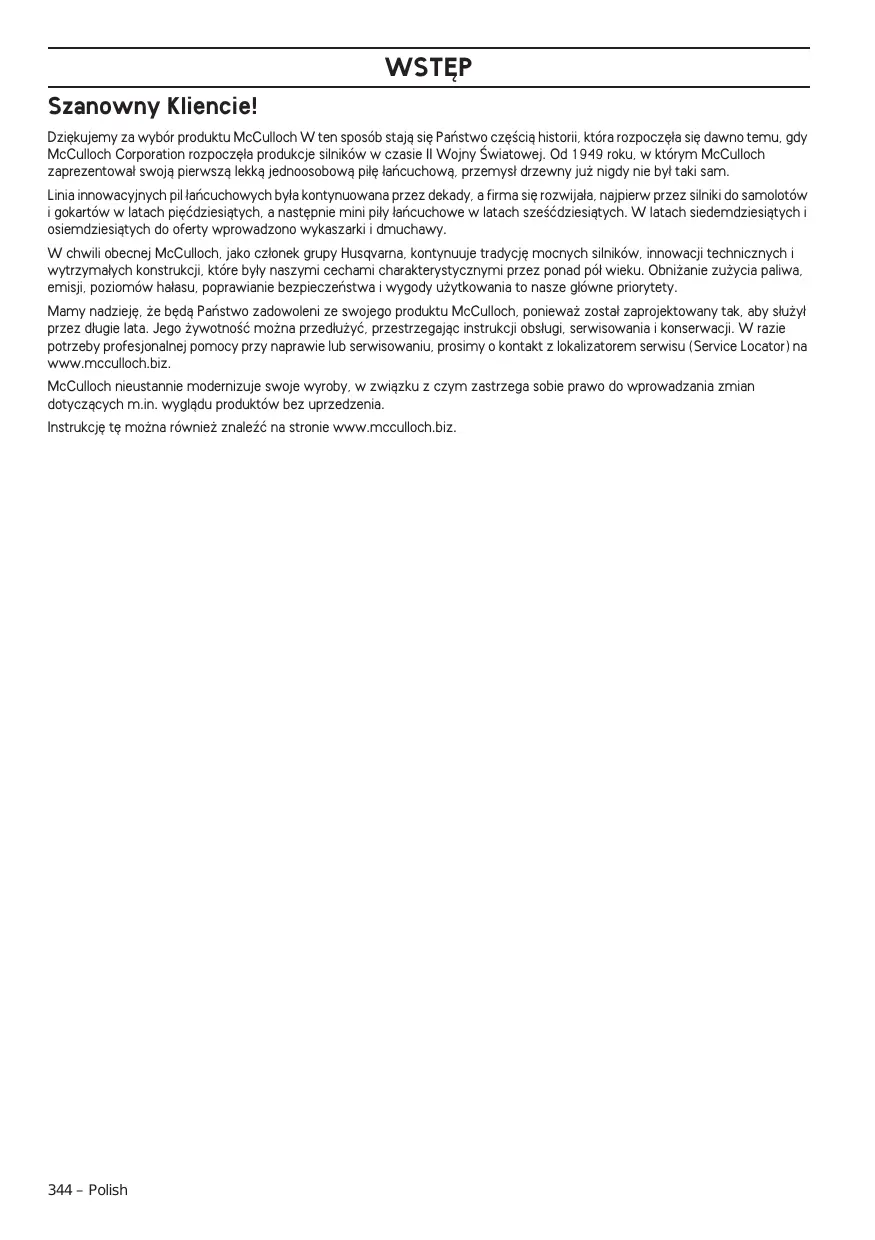Polish – 343 WST¢P Szanowny Kliencie! Dzi´kujemy za wybór produktu McCulloch W ten sposób stajà si´ Paƒstwo cz´Êcià historii, która rozpocz´∏a si´ dawno temu, gdy McCulloch Corporation rozpocz´∏a produkcje silników w czasie II Wojny Âwiatowej. Od 1949 roku, w którym McCulloch zaprezentowa∏ swojà pierwszà lekkà jednoosobowà pi∏´ ∏aƒcuchowà, przemys∏ drzewny ju˝ nigdy nie by∏ taki sam. Linia innowacyjnych pil ∏aƒcuchowych by∏a kontynuowana przez dekady, a firma si´ rozwija∏a, najpierw przez silniki do samolotów i gokartów w latach pi´çdziesiàtych, a nast´pnie mini pi∏y ∏aƒcuchowe w latach szeÊçdziesiàtych. W latach siedemdziesiàtych i osiemdziesiàtych do oferty wprowadzono wykaszarki i dmuchawy. W chwili obecnej McCulloch, jako cz∏onek grupy Husqvarna, kontynuuje tradycj´ mocnych silników, innowacji technicznych i wytrzyma∏ych konstrukcji, które by∏y naszymi cechami charakterystycznymi przez ponad pó∏ wieku. Obni˝anie zu˝ycia paliwa, emisji, poziomów ha∏asu, poprawianie bezpieczeƒstwa i wygody u˝ytkowania to nasze g∏ówne priorytety. Mamy nadziej´, ˝e b´dà Paƒstwo zadowoleni ze swojego produktu McCulloch, poniewa˝ zosta∏ zaprojektowany tak, aby s∏u˝y∏ przez d∏ugie lata. Jego ˝ywotnoÊç mo˝na przed∏u˝yç, przestrzegajàc instrukcji obs∏ugi, serwisowania i konserwacji. W razie potrzeby profesjonalnej pomocy przy naprawie lub serwisowaniu, prosimy o kontakt z lokalizatorem serwisu (Service Locator) na www.mcculloch.biz. McCulloch nieustannie modernizuje swoje wyroby, w zwiàzku z czym zastrzega sobie prawo do wprowadzania zmian dotyczàcych m.in. wyglàdu produktów bez uprzedzenia. Instrukcj´ t´ mo˝na równie˝ znaleêç na stronie www.mcculloch.biz. 344 – Polish CO JEST CO?