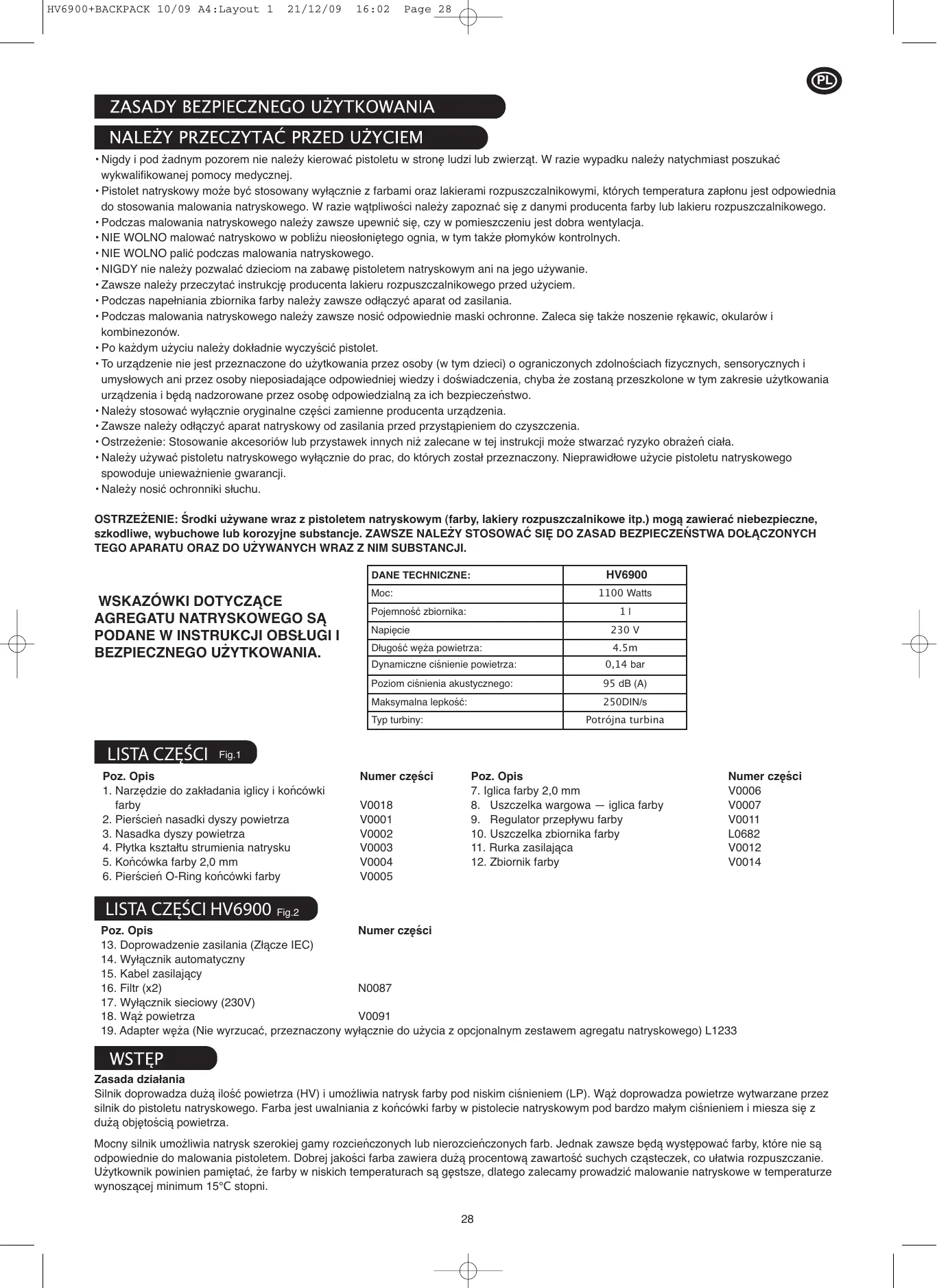 BEZPIECZNEGO UŻYTKOWANIA. HV6900 DANE TECHNICZNE: 1100 Watts Moc: Pojemność zbiornika: Napięcie Długość węża powietrza: Dynamiczne ciśnienie powietrza: Poziom ciśnienia akustycznego: Maksymalna lepkość: Fig.1 Poz. Opis