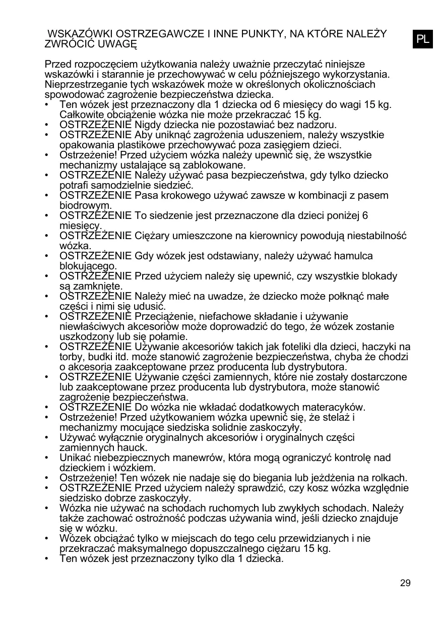 PL Przed rozpoczęciem użytkowania należy uważnie przeczytać niniejsze wskazówki i starannie je przechowywać w celu późniejszego wykorzystania. Nieprzestrzeganie tych wskazówek może w określonych okolicznościach spowodować zagrożenie bezpieczeństwa dziecka. • Ten wózek jest przeznaczony dla 1 dziecka od 6 miesięcy do wagi 15 kg. Całkowite obciążenie wózka nie może przekraczać 15 kg. • OSTRZEŻENIE Nigdy dziecka nie pozostawiać bez nadzoru. • OSTRZEŻENIE Aby uniknąć zagrożenia uduszeniem, należy wszystkie opakowania plastikowe przechowywać poza zasięgiem dzieci. • Ostrzeżenie! Przed użyciem wózka należy upewnić się, że wszystkie mechanizmy ustalające są zablokowane. • OSTRZEŻENIE Należy używać pasa bezpieczeństwa, gdy tylko dziecko potrafi samodzielnie siedzieć. • OSTRZEŻENIE Pasa krokowego używać zawsze w kombinacji z pasem biodrowym. • OSTRZEŻENIE To siedzenie jest przeznaczone dla dzieci poniżej 6 miesięcy. • OSTRZEŻENIE Ciężary umieszczone na kierownicy powodują niestabilność wózka. • OSTRZEŻENIE Gdy wózek jest odstawiany, należy używać hamulca blokującego. • OSTRZEŻENIE Przed użyciem należy się upewnić, czy wszystkie blokady są zamknięte. • OSTRZEŻENIE Należy mieć na uwadze, że dziecko może połknąć małe części i nimi się udusić. • OSTRZEŻENIE Przeciążenie, niefachowe składanie i używanie niewłaściwych akcesoriów może doprowadzić do tego, że wózek zostanie uszkodzony lub się połamie. • OSTRZEŻENIE Używanie akcesoriów takich jak foteliki dla dzieci, haczyki na torby, budki itd. może stanowić zagrożenie bezpieczeństwa, chyba że chodzi o akcesoria zaakceptowane przez producenta lub dystrybutora. • OSTRZEŻENIE Używanie części zamiennych, które nie zostały dostarczone lub zaakceptowane przez producenta lub dystrybutora, może stanowić zagrożenie bezpieczeństwa. • OSTRZEŻENIE Do wózka nie wkładać dodatkowych materacyków. • Ostrzeżenie! Przed użytkowaniem wózka upewnić się, że stelaż i mechanizmy mocujące siedziska solidnie zaskoczyły. • Używać wyłącznie oryginalnych akcesoriów i oryginalnych części zamiennych hauck. • Unikać niebezpiecznych manewrów, która mogą ograniczyć kontrolę nad dzieckiem i wózkiem. • Ostrzeżenie! Ten wózek nie nadaje się do biegania lub jeżdżenia na rolkach. • OSTRZEŻENIE Przed użyciem należy sprawdzić, czy kosz wózka względnie siedzisko dobrze zaskoczyły. • Wózka nie używać na schodach ruchomych lub zwykłych schodach. Należy także zachować ostrożność podczas używania wind, jeśli dziecko znajduje się w wózku. • Wózek obciążać tylko w miejscach do tego celu przewidzianych i nie przekraczać maksymalnego dopuszczalnego ciężaru 15 kg. • Ten wózek jest przeznaczony tylko dla 1 dziecka. 29
