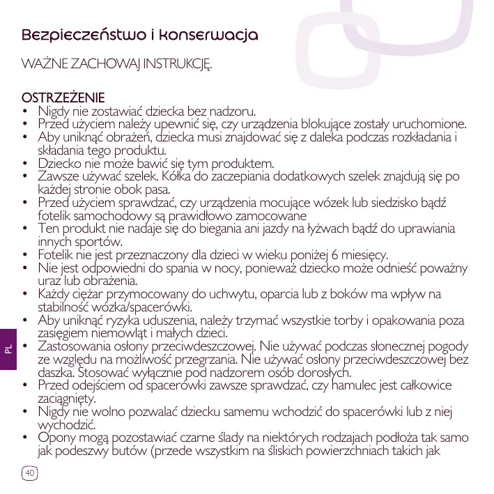 • Pour éviter toute blessure, maintenir votre enfant à l’écart lors du dépliage et du pliage du produit. • Ne pas laisser votre enfant jouer avec ce produit. • Toujours utiliser le système de retenue. Des anneaux pour la fixation d’un harnais supplémentaire sont situés au niveau de la ceinture de maintien, de chaque côté. • Vérifier que les dispositifs de fixation de la nacelle, du siège ou du siège-auto sont correctement enclenchés avant utilisation. • Ne pas utiliser ce produit en faisant du jogging ou des promenades en rollers et toutes autres activités sportives. • Ne pas utiliser ce siège pour des enfants de moins de 6 mois. • Ne convient pas pour de longue période de sommeil, votre enfant risquerait d’être en danger. • Le fait d’accrocher une charge au poussoir, dossier ou côtés influe sur la stabilité du landau/de la poussette. • Pour éviter les risques d’étouffement, conservez les sacs plastique de l’emballage hors de portée des bébés et des jeunes enfants. • Utilisation de l’habillage-pluie: Ne pas utiliser en cas de temps ensoleillé, pour cause de chaleur excessive. Ne pas utiliser l’habillage pluie sans la capote. A utiliser sous la surveillance d’un adulte. • Toujours vérifier que le frein est bien engagé avant de lâcher votre poussette. • Ne jamais laisser votre enfant monter et descendre seul de la poussette. • Les pneus peuvent laisser des traces noires sur certains sols (surtout les sols lisses comme les parquets, les laminés synthétiques, le linoléum, etc.). 19