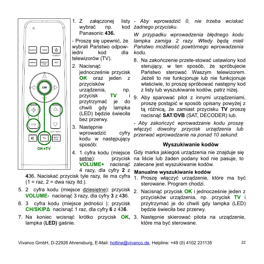 TV para terminar de esta manera el proceso búsqueda demasiado de búsqueda. Se apaga la luz (LED). tarde, vuelva a realizarla con Búsqueda de - El proceso de búsqueda es interrumpido código manual (ver más arriba). después de unos 30 segundos de inactividad. 5. Para terminar debe controlar el código de mando elegido. Si no funciona Búsqueda de código automática correctamente, debe repetir de nuevo la 1. Active el aparato a controlar y elija un búsqueda de código. Entonces, el modo de programa de TV. búsqueda es iniciado a partir del código 2. Pulse la tecla OK y, a continuación, una de próximo. las teclas del aparato, por ejemplo, la tecla Vivanco GmbH, D-22926 Ahrensburg, E-Mail: hotline@vivanco.de, Helpline: +49 (0) 4102 231135