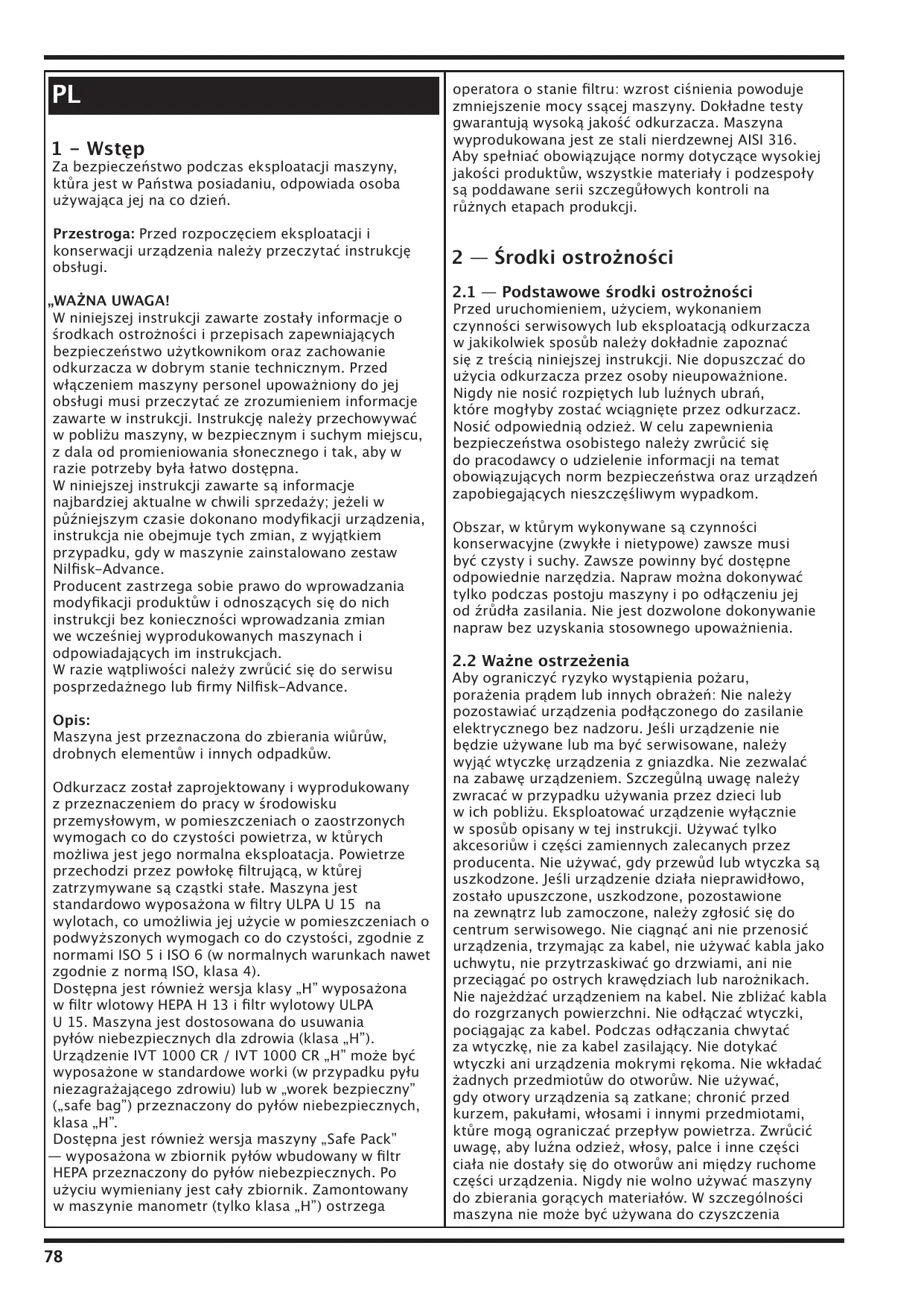 Het filterpatroon en de pakkingen verwijderen en vervangen Schroef de vier schroeven los. Til de roestvrij stalen behuizing met het filterpatroon op. Vervang het filterpatroon en de pakkingen. Plaats de behuizing terug door op de bovenkant ervan te drukken en de vier schroeven terug vast te schroeven. Monteer de handgreep terug en zet vast met de 2 schroeven. De gedemonteerde en vervangen uitblaasfilter moet worden opgeborgen in een plastic tas en moet op de gepaste manier worden weggeruimd. Wees bijzonder voorzichtig bij het vervangen van de hoofdfilter en uitblaasfilter, en draag in ieder geval een masker type P3. Opmerking De uitblaasfilter wordt beschouwd als giftig afval en moet ook als dusdanig worden behandeld. Le présent manuel a été rédigé afin dʼinformer les utilisateurs de la machine sur les précautions et les réglementations relatives à leur sécurité, et de maintenir lʼaspirateur en bon état de fonctionnement. Le personnel autorisé à travailler avec la machine doit comprendre le manuel avant de la mettre en marche. Garder le manuel à proximité de la machine, à un emplacement sec et protégé, non exposé à la lumière directe du soleil et immédiatement disponible pour être consulté au besoin. Le présent manuel reflète lʼétat le plus récent de la technologie au moment de la vente et ne peut pas être considéré comme approprié en cas de modifications ultérieures, sauf si un kit Nilfisk- Advance a été installé sur la machine. Le fabricant se réserve le droit de mettre à jour sa gamme de production et les manuels qui sʼy rapportent sans être tenu de mettre à jour les machines et manuels précédemment fournis. Consulter le centre de service après-vente le plus proche ou Nilfisk-Advance en cas de doute. Description : Cette machine a été conçue pour ramasser les copeaux, les débris, la poussière et autres déchets. Lʼaspirateur a été conçu et construit pour fonctionner en environnement industriel tel quʼune salle blanche où il peut servir au nettoyage normal. De lʼair passe à travers une surface filtrante où les solides en suspension sont retenus. En version standard, la machine est équipée de filtres de refoulement ULPA U 15 qui rendent la machine apte à une utilisation en salles blanches ISO 5 ET ISO 6 (en conditions normales, même ISO classe 4). Une version de classe « H » équipée dʼun filtre amont HEPA H 13 et dʼun filtre aval ULPA U 15 est également disponible. En classe « H », cette machine convient aussi contre les poussières présentant un risque pour la santé. Les modèles IVT 1000 CR / IVT 1000 CR «H» peuvent être équipé dʼun sac à poussière standard (poussière non dangereuse) ou dʼun « sac de sécurité » convenant à la poussière dangereuse en classe « H ». Une version « Safe Pack » de la machine est également disponible - celle-ci comporte un bac de ramassage de la poussière avec filtre HEPA intégré, utilisable pour la poussière dangereuse. Le bac complet est remplacé après usage. La jauge de pression installée sur la machine (classe « H » uniquement) prévient lʼopérateur de lʼétat du filtre : une augmentation de pression représente une réduction de la puissance dʼaspiration de la machine La qualité élevée de lʼaspirateur est garantie par les tests les plus sévères.