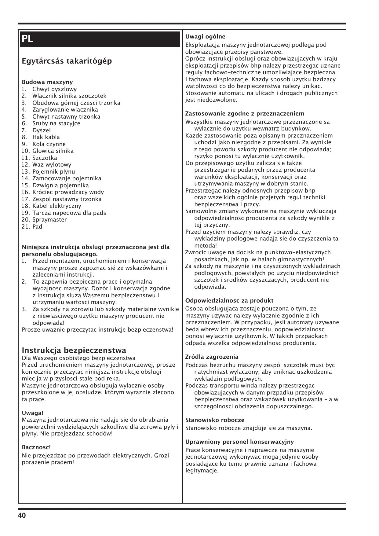 Outre les instructions de service et les réglementations relatives à la prévention des accidents en vigueur dans le pays dʼutilisation, il convient dʼobserver les règles techniques reconnues pour des travaux effectués dans les règles de lʼart et en toute sécurité. Toute utilisation constituant un risque pour la sécurité est interdite. Lʼutilisation de la monobrosse sur des voies publiques et rues est interdite. Utilisation conforme aux dispositions Les monobrosses sont toutes exclusivement réservées à une utilisation à lʼintérieur de bâtiments. Une utilisation autre est considérée comme non conforme. Le fabricant décline toute responsabilité pour les dommages en résultant; le risque est exclusivement supporté par lʼutilisateur. Une utilisation de la monobrosse conformément aux fins auxquelles elle est destinée implique aussi le respect des conditions de service, dʼentretien et de maintenance prescrites par le fabricant. Les prescriptions de prévention des accidents correspondantes ainsi que les règles techniques de sécurité et de travail générales reconnues sont à respecter. Des modifications apportées à la machine excluent la responsabilité du fabricant pour les dommages en résultant. Avant dʼutiliser la machine, les revêtements de sol doivent être contrêlés pour savoir sʼils conviennent à ce procédé de nettoyage! Il doit être tenu compte de la compression des surfaces en présence de sols à élasticité ponctuelle, p. ex. dans les halls de sport! Le fabricant nʼest pas responsable des endommagements de lʼappareil et du revêtement à nettoyer liés à lʼutilisation de brosses et produits de nettoyage inadéquats. Responsabilité en matière de produit Lʼattention de lʼutilisateur est expressément attirée sur le fait que les monobrosses doivent uniquement être utilisées conformément aux fins auxquelles elles sont destinées. Au cas où les monobrosses ne pourraient pas être employées conformément aux dispositions, leur utilisation se fera sous lʼentière responsabilité de lʼutilisateur. Toute responsabilité du fabricant expire dans ce cas. Sources de dangers A lʼarrêt de la monobrosse, le groupe de brosses doit immédiatement être mis hors service pour ne pas endommager les reêtemens de sol. Si la monobrosse est transportée dans des ascenseurs, les consignes dʼutilisation respectivement en vigueur ainsi que les prescriptions de sécurité – et notamment la portance – sont à observer. Poste de travail Le poste de travail se trouve derrière la monobrosse. Personnel autorisé pour lʻentretien La monobrosse doit uniquement être entretenue et maintenue par des personnes en possession dʼautorisations professionelles et légales. Produits de nettoyage