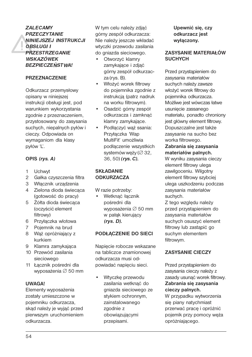 • Ouvrir les crochets de fermeture et déposer la partie supérieure de l’aspirateur (Fig. B). • Introduire le sac à poussière dans la cuve conformément à la notice (imprimée sur le sac). • Remettre la partie supérieure de l’aspirateur et fermer les crochets. • Raccorder le tuyau flexible d’aspiration. Le raccord ‘Wap MultiFit’ permet de connecter tous les systèmes de tuyaux flexibles d’aspiration Wap (Ø 32, 36, 50) (Fig. C). ASSEMBLAGE Au besoin : • Emboîter l’adaptateur pour accessoire de Ø 50 mm dans la poignée (Fig. D). BRANCHEMENT ELECTRIQUE La tension de service indiquée sur la plaque signalétique doit correspondre à la tension du réseau de distribution. • Brancher la fiche du cordon dans une prise secteur de sécurité installée de façon réglementaire.