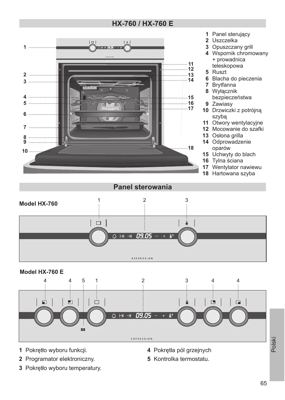 Panel sterujący Uszczelka Opuszczany grill Wspornik chromowany + prowadnica teleskopowa Ruszt Blacha do pieczenia Brytfanna Wyłącznik bezpieczeństwa Zawiasy Drzwiczki z potrójną szybą Otwory wentylacyjne Mocowanie do szafki Osłona grilla Odprowadzenie oparów Uchwyty do blach Tylna ściana Wentylator nawiewu Hartowana szyba Panel sterowania