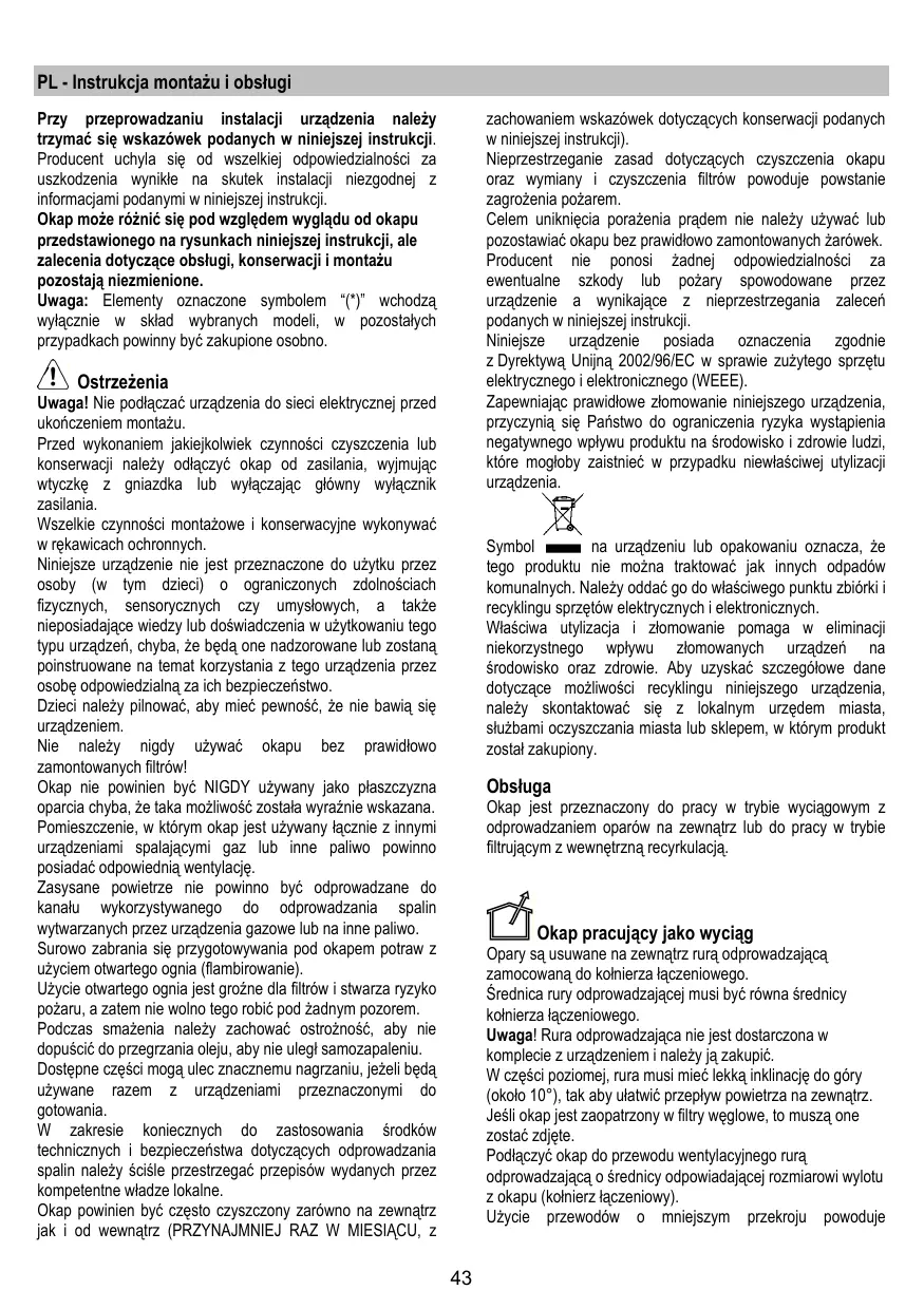 zachowaniem wskazówek dotyczących konserwacji podanych w niniejszej instrukcji). Nieprzestrzeganie zasad dotyczących czyszczenia okapu oraz wymiany i czyszczenia filtrów powoduje powstanie zagrożenia pożarem. Celem uniknięcia porażenia prądem nie należy używać lub pozostawiać okapu bez prawidłowo zamontowanych żarówek. Producent nie ponosi żadnej odpowiedzialności za ewentualne szkody lub pożary spowodowane przez urządzenie a wynikające z nieprzestrzegania zaleceń podanych w niniejszej instrukcji. Niniejsze urządzenie posiada oznaczenia zgodnie z Dyrektywą Unijną 2002/96/EC w sprawie zużytego sprzętu elektrycznego i elektronicznego (WEEE). Zapewniając prawidłowe złomowanie niniejszego urządzenia, przyczynią się Państwo do ograniczenia ryzyka wystąpienia negatywnego wpływu produktu na środowisko i zdrowie ludzi, które mogłoby zaistnieć w przypadku niewłaściwej utylizacji urządzenia.