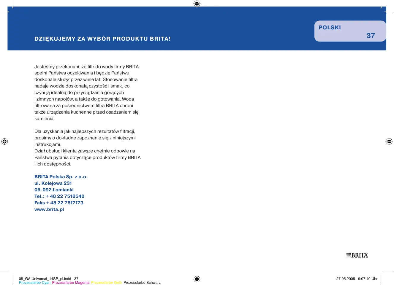Jesteśmy przekonani, że filtr do wody firmy BRITA spełni Państwa oczekiwania i będzie Państwu doskonale służył przez wiele lat. Stosowanie filtra nadaje wodzie doskonałą czystość i smak, co czyni ją idealną do przyrządzania gorących i zimnych napojów, a także do gotowania. Woda filtrowana za pośrednictwem filtra BRITA chroni także urządzenia kuchenne przed osadzaniem się kamienia. Dla uzyskania jak najlepszych rezultatów filtracji, prosimy o dokładne zapoznanie się z niniejszymi instrukcjami. Dział obsługi klienta zawsze chętnie odpowie na Państwa pytania dotyczące produktów firmy BRITA i ich dostępności. BRITA Polska Sp. z o.o. ul. Kolejowa 231 05-092 Łomianki Tel.: + 48 22 7518540 Faks + 48 22 7517173 www.brita.pl 05_GA Universal_14SP_pl.indd 37 Prozessfarbe Cyan Prozessfarbe Magenta Prozessfarbe Gelb Prozessfarbe Schwarz PANTONE 287