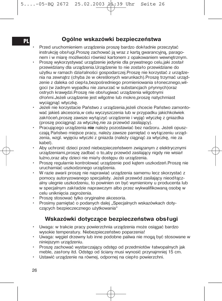- Pracujacego urzadzenia nie nalezy pozostawiac bez nadzoru. Jezieli opuszczaja Państwo.), węjęciu w tymczki z gniażda (nalezy ciagna za w tymczke, nie za kabel).
