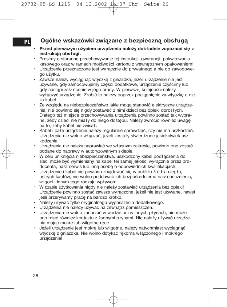 • Przed pierwszym użyciem urządzenia należy dokładnie zapoznać się z instrukcją obsługi. • Prosimy o staranne przechowywanie tej instrukcji, gwarancji, pokwitowania kasowego oraz w ramach możliwości kartonu z wewnętrznym opakowaniem! • Urządzenie przeznaczone jest wyłącznie do prywatnego a nie do zawodowego użytku. • Zawsze należy wyciągnąć wtyczkę z gniazdka, jeżeli urządzenie nie jest używane, gdy zamocowujemy części dodatkowe, urządzenie czyścimy lub gdy nastąpi zakłócenie w jego pracy. W pierwszej kolejności należy wyłączyć urządzenie. Zrobić to należy poprzez pociągnięcie za wtyczkę a nie za kabel. • Ze względu na niebezpieczeństwo jakie mogą stanowić elektryczne urządzenia, nie powinno się nigdy zostawać z nimi dzieci bez opieki dorosłych. Dlatego też miejsce przechowywania urządzenia powinno zostać tak wybrane, żeby dzieci nie miały do niego dostępu. Należy zwrócić również uwagę na to, żeby kabel nie zwisał. • Kabel i całe urządzenie należy regularnie sprawdzać, czy nie ma uszkodzeń. Urządzenia nie wolno włączać, jeżeli zostały stwierdzone jakiekolwiek uszkodzenia. • Urządzenia nie należy naprawiać we własnym zakresie, powinno ono zostać oddane do naprawy w autoryzowanym sklepie. • W celu uniknięcia niebezpieczeństwa, uszkodzony kabel podłączenia do sieci może być wymieniany na kabel tej samej jakości wyłącznie przez producenta, nasz serwis lub inną osobę o odpowiednich kwalifikacjach. • Urządzenie i kabel nie powinno znajdować się w pobliżu źródła ciepła, ostrych kantów, nie wolno poddawać ich bezpośredniemu nasłonecznieniu, wilgoci i innym tego rodzaju wpływom. • W czasie użytkowania nigdy nie należy zostawiać urządzenia bez opieki! Urządzenie powinno zostać zawsze wyłączone, jeżeli nie jest używane, nawet jeśli przerywamy pracę na bardzo krótko. • Należy używać tylko oryginalnego wyposażenia dodatkowego. • Urządzenia nie należy używać na zewnątrz pomieszczeń. • Urządzenia nie wolno zanurzać w wodzie ani w innych płynach, nie może ono mieć również kontaktu z żadnymi płynami. Nie należy używać urządzenia mając mokre lub wilgotne ręce. • Jeżeli urządzenie jest mokre lub wilgotne, należy natychmiast wyciągnąć wtyczkę z gniazdka. Nie wolno dotykać rękoma włączonego i mokrego urządzenia!
