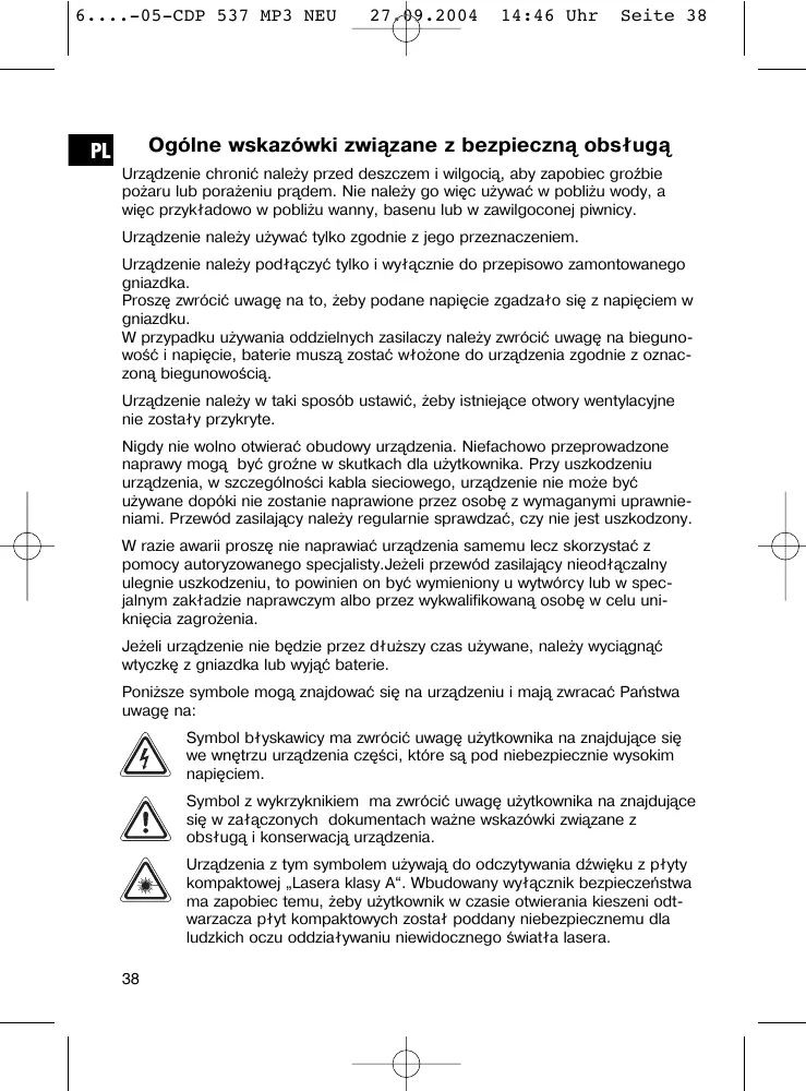 Urzadzenia z tym symbolem uzywaja do odczytwnia dzwieku z płyty kompaktowej „Lasera klasy A". Wbudowany wyłącznik bezpieczność sta ma zapobiec temu, zȩby uzytkownik w czasie otworiania kieszeni odtwarzacza pły tkompaktowych zostar poddany niebepiecznescu dla ludzkich oczu oddziątwyaniu niewidocznych swiatá lasera.