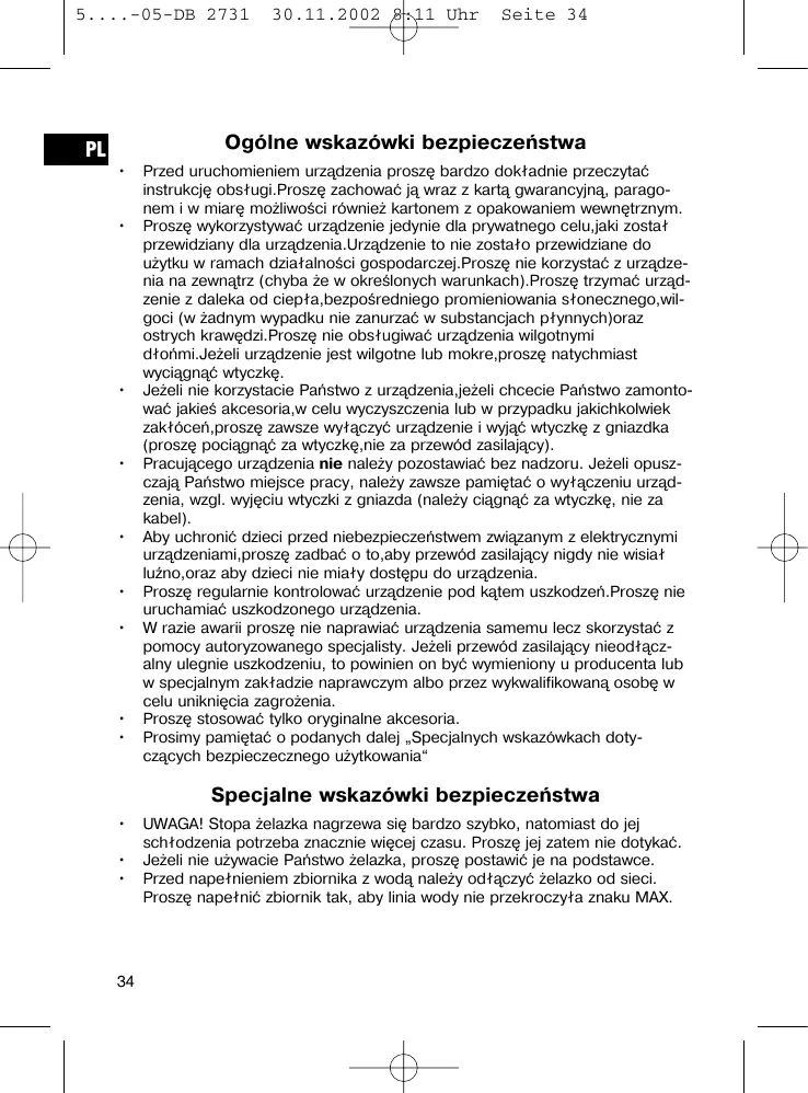 UWAGA! Stopa żelazka nagrzewa się bardzo szybko, natomiast do jej schłodzenia potrzeba znacznie więcej czasu. Proszę jej zatem nie dotykać. Jeżeli nie używacie Państwo żelazka, proszę postawić je na podstawce. Przed napełnieniem zbiornika z wodą należy odłączyć żelazko od sieci. Proszę napełnić zbiornik tak, aby linia wody nie przekroczyła znaku MAX.