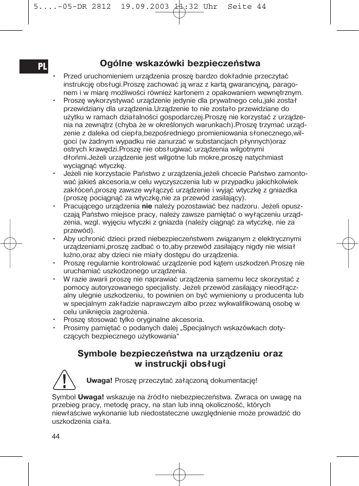 Przed uruchomieniem urządzenia proszę bardzo dokładnie przeczytać instrukcję obsługi.Proszę zachować ją wraz z kartą gwarancyjną, paragonem i w miarę możliwości również kartonem z opakowaniem wewnętrznym. Proszę wykorzystywać urządzenie jedynie dla prywatnego celu,jaki został przewidziany dla urządzenia.Urządzenie to nie zostało przewidziane do użytku w ramach działalności gospodarczej.Proszę nie korzystać z urządzenia na zewnątrz (chyba że w określonych warunkach).Proszę trzymać urządzenie z daleka od ciepła,bezpośredniego promieniowania słonecznego,wilgoci (w żadnym wypadku nie zanurzać w substancjach płynnych)oraz ostrych krawędzi.Proszę nie obsługiwać urządzenia wilgotnymi dłońmi.Jeżeli urządzenie jest wilgotne lub mokre,proszę natychmiast wyciągnąć wtyczkę. Jeżeli nie korzystacie Państwo z urządzenia,jeżeli chcecie Państwo zamontować jakieś akcesoria,w celu wyczyszczenia lub w przypadku jakichkolwiek zakłóceń,proszę zawsze wyłączyć urządzenie i wyjąć wtyczkę z gniazdka (proszę pociągnąć za wtyczkę,nie za przewód zasilający). Pracującego urządzenia nie należy pozostawiać bez nadzoru. Jeżeli opuszczają Państwo miejsce pracy, należy zawsze pamiętać o wyłączeniu urządzenia, wzgl. wyjęciu wtyczki z gniazda (należy ciągnąć za wtyczkę, nie za przewód). Aby uchronić dzieci przed niebezpieczeństwem związanym z elektrycznymi urządzeniami,proszę zadbać o to,aby przewód zasilający nigdy nie wisiał luźno,oraz aby dzieci nie miały dostępu do urządzenia. Proszę regularnie kontrolować urządzenie pod kątem uszkodzeń.Proszę nie uruchamiać uszkodzonego urządzenia. W razie awarii proszę nie naprawiać urządzenia samemu lecz skorzystać z pomocy autoryzowanego specjalisty. Jeżeli przewód zasilający nieodłączalny ulegnie uszkodzeniu, to powinien on być wymieniony u producenta lub w specjalnym zakładzie naprawczym albo przez wykwalifikowaną osobę w celu uniknięcia zagrożenia. Proszę stosować tylko oryginalne akcesoria. Prosimy pamiętać o podanych dalej „Specjalnych wskazówkach dotyczących bezpiecznego użytkowania“ Symbole bezpieczeństwa na urządzeniu oraz w instruckji obsługi Uwaga! Proszę przeczytać załączoną dokumentację! Symbol Uwaga! wskazuje na źródło niebezpieczeństwa. Zwraca on uwagę na przebieg pracy, metodę pracy, na stan lub inną okoliczność, których niewłaściwe wykonanie lub niedostateczne uwzględnienie może prowadzić do uszkodzenia ciała.