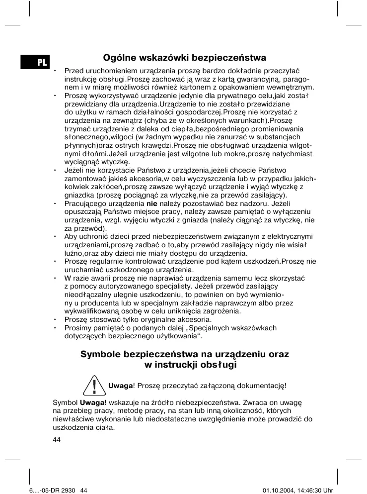 Przed uruchomieniem urządzenia proszę bardzo dokładnie przeczytać instrukcję obsługi.Proszę zachować ją wraz z kartą gwarancyjną, paragonem i w miarę możliwości również kartonem z opakowaniem wewnętrznym. Proszę wykorzystywać urządzenie jedynie dla prywatnego celu,jaki został przewidziany dla urządzenia.Urządzenie to nie zostało przewidziane do użytku w ramach działalności gospodarczej.Proszę nie korzystać z urządzenia na zewnątrz (chyba że w określonych warunkach).Proszę trzymać urządzenie z daleka od ciepła,bezpośredniego promieniowania słonecznego,wilgoci (w żadnym wypadku nie zanurzać w substancjach płynnych)oraz ostrych krawędzi.Proszę nie obsługiwać urządzenia wilgotnymi dłońmi.Jeżeli urządzenie jest wilgotne lub mokre,proszę natychmiast wyciągnąć wtyczkę. Jeżeli nie korzystacie Państwo z urządzenia,jeżeli chcecie Państwo zamontować jakieś akcesoria,w celu wyczyszczenia lub w przypadku jakichkolwiek zakłóceń,proszę zawsze wyłączyć urządzenie i wyjąć wtyczkę z gniazdka (proszę pociągnąć za wtyczkę,nie za przewód zasilający). Pracującego urządzenia nie należy pozostawiać bez nadzoru. Jeżeli opuszczają Państwo miejsce pracy, należy zawsze pamiętać o wyłączeniu urządzenia, wzgl. wyjęciu wtyczki z gniazda (należy ciągnąć za wtyczkę, nie za przewód). Aby uchronić dzieci przed niebezpieczeństwem związanym z elektrycznymi urządzeniami,proszę zadbać o to,aby przewód zasilający nigdy nie wisiał luźno,oraz aby dzieci nie miały dostępu do urządzenia. Proszę regularnie kontrolować urządzenie pod kątem uszkodzeń.Proszę nie uruchamiać uszkodzonego urządzenia. W razie awarii proszę nie naprawiać urządzenia samemu lecz skorzystać z pomocy autoryzowanego specjalisty. Jeżeli przewód zasilający nieodłączalny ulegnie uszkodzeniu, to powinien on być wymieniony u producenta lub w specjalnym zakładzie naprawczym albo przez wykwalifikowaną osobę w celu uniknięcia zagrożenia. Proszę stosować tylko oryginalne akcesoria. Prosimy pamiętać o podanych dalej „Specjalnych wskazówkach dotyczących bezpiecznego użytkowania“. Symbole bezpieczeństwa na urządzeniu oraz w instruckji obsługi Uwaga! Proszę przeczytać załączoną dokumentację! Symbol Uwaga! wskazuje na źródło niebezpieczeństwa. Zwraca on uwagę na przebieg pracy, metodę pracy, na stan lub inną okoliczność, których niewłaściwe wykonanie lub niedostateczne uwzględnienie może prowadzić do uszkodzenia ciała.