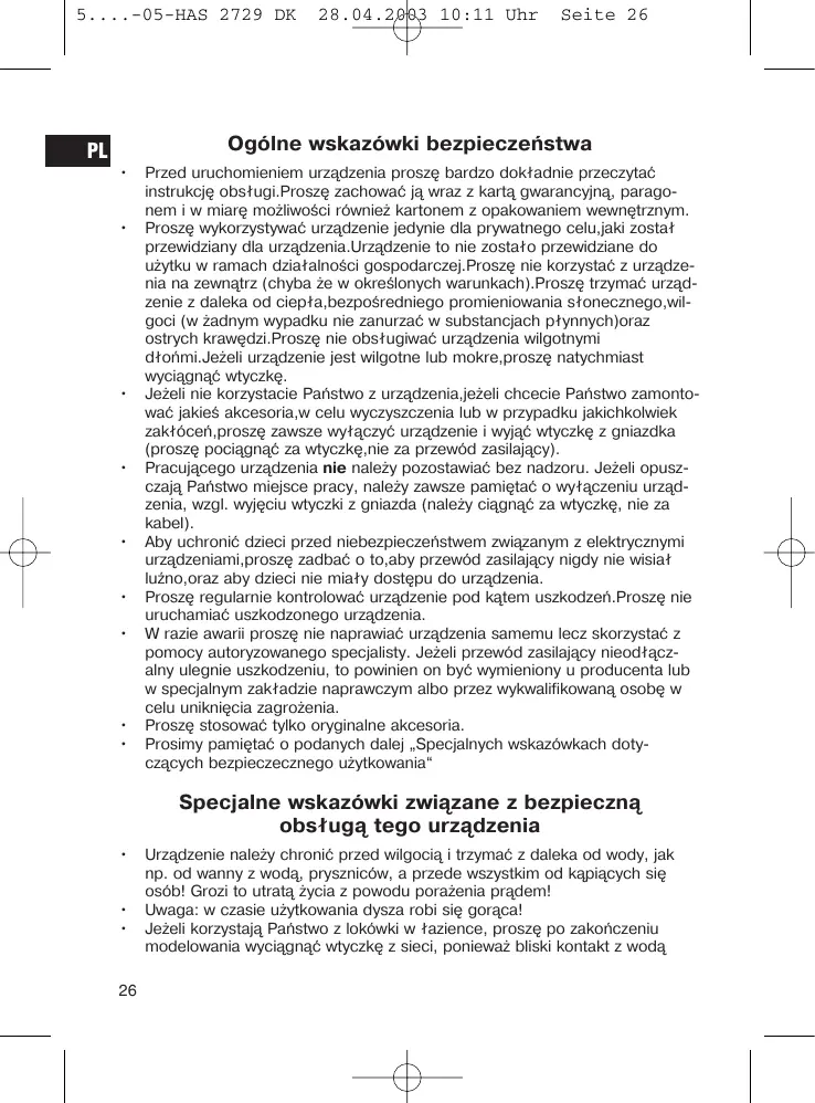 Prosz wykorystywać urzadzenia jedynie dla prywatné celu, jaki zostaf przewidziancy dla urzadzenia. Urzadzenia to nie zostało przywiedziane do uzytku w ramach dziatnalosci gospodarczej. Prosze nie korzystać z urzadzenia na zewnatrz (chbyza ze w okreslonych warunkach). Prosze trzymać urzadzenia z daleka od ciepta, bezposredniogo promieniowania sitoneczego, wilgoci (w zadnym wypadku nie zanurzać w substancjach pflynnych)oraz ostrych krawedzi.Prosze nie obstugiwuć urzadzenia wilgotnych dformi. Jeźeli urzadzenia jest wilgotne lub mokre, prosze natychmiast wyciagnac wtyczke. - Ježeli nie korzystacie Pański zo urzadzenia, ježeli checie Pański za montowac jakiej akcesoria, welu wyczyszczenia lub w przypadku jakichkolwiek zakfocen, prosze zawsze wyȩczyć urzadzenia i wyȩć wtyczka z gniażdka (prosze pociąnę za wtyczka,Nie za przywód zasilajść).
