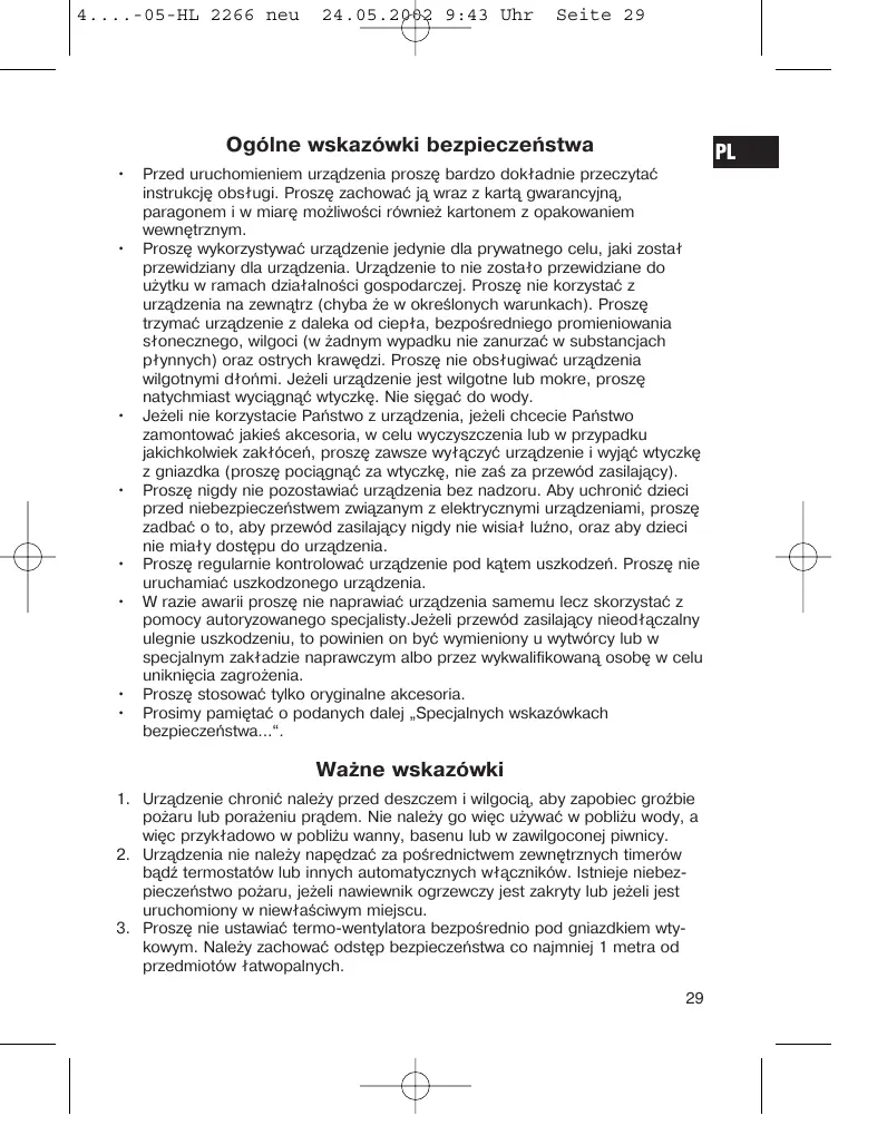 Prosze nigdy nie pozostawiać urzadzenia bez nadzoru. Aby uchronic daneci prsed niedoeba piecieznstwem zwiazonym z elektrycznych urzadzeniami, prosze zadbać o to, aby przewód zasilajczy nigdy nie wisią luzno, oraz aby daneci nie miały dostepu do urzadzenia. - Prosze regularnie kontrolowa urzadzenie pod katem uszkodzen. Prosze nie uruchamiauc uszkodzonego urzadzenia.