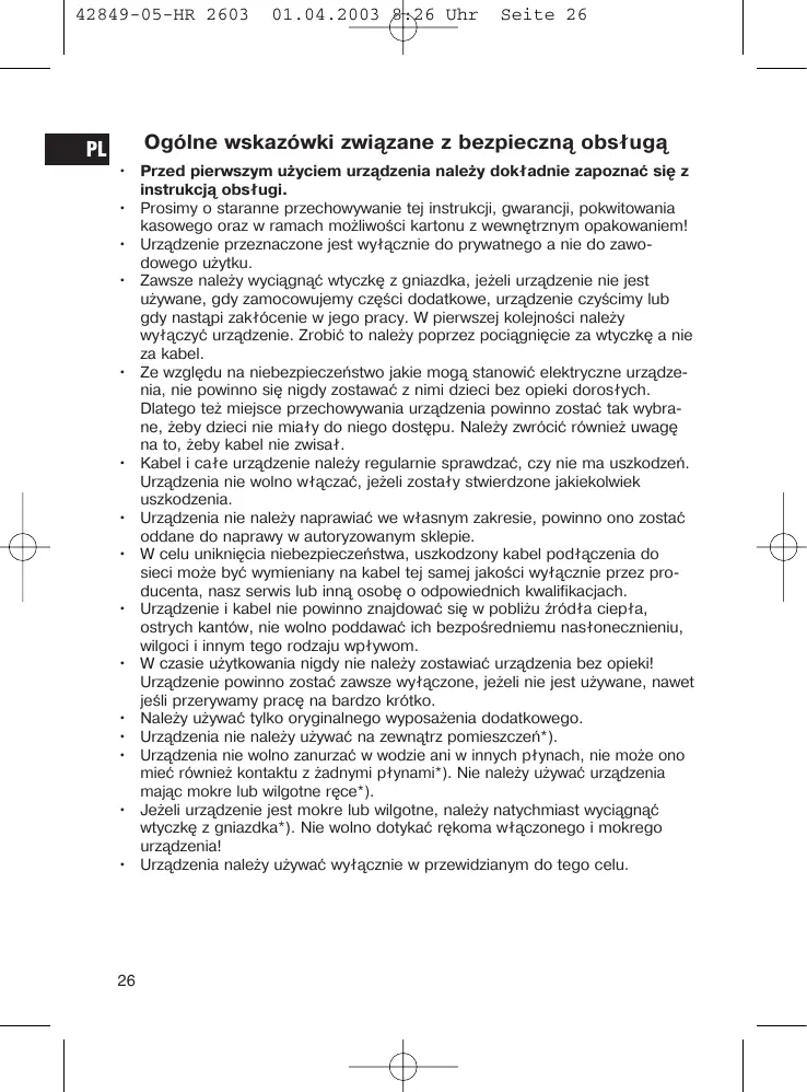 W czasie uzytkowania nigdy nie nalezy dostawiać urzadzenia bez opieki! Urzadzenia powinno zostac zawsze wyłaczone, jeźeli nie jest uzywane, nawet jejli przerywamy przyne na bardzo krótko. - Nalezy uzywać tylko oryginalnégo wyposañenia dodatkowej.