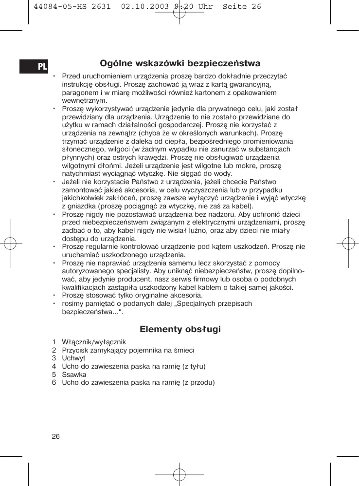 Włącznik/wyłącznik Przycisk zamykający pojemnika na śmieci Uchwyt Ucho do zawieszenia paska na ramię (z tyłu) Ssawka Ucho do zawieszenia paska na ramię (z przodu) 44084-05-HS 2631