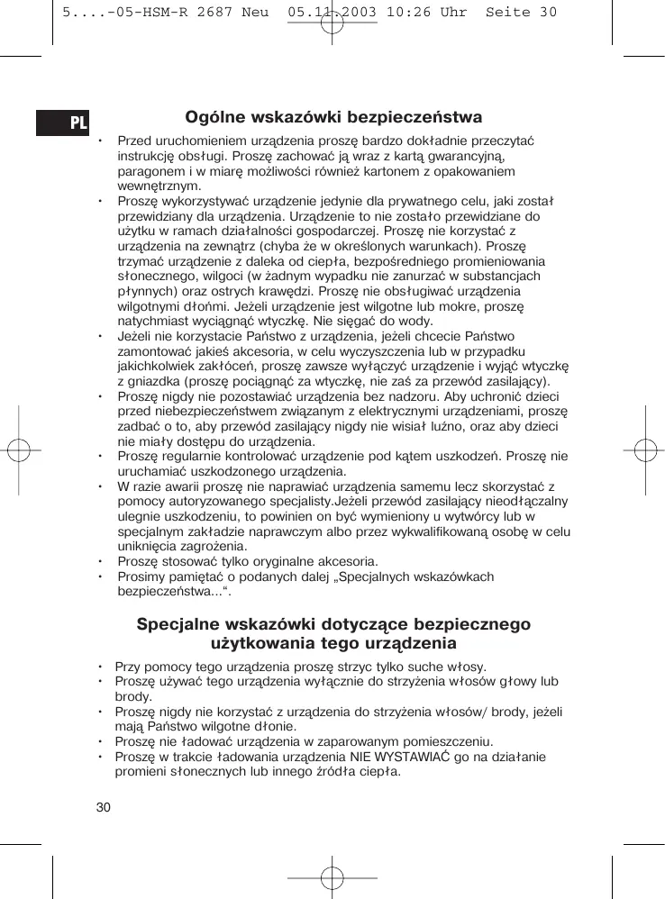 Specjalne wskazówki dotyczące bezpiecznego użytkowania tego urządzenia • Przy pomocy tego urządzenia proszę strzyc tylko suche włosy. • Proszę używać tego urządzenia wyłącznie do strzyżenia włosów głowy lub brody. • Proszę nigdy nie korzystać z urządzenia do strzyżenia włosów/ brody, jeżeli mają Państwo wilgotne dłonie. • Proszę nie ładować urządzenia w zaparowanym pomieszczeniu. • Proszę w trakcie ładowania urządzenia NIE WYSTAWIAĆ go na działanie promieni słonecznych lub innego źródła ciepła. 30