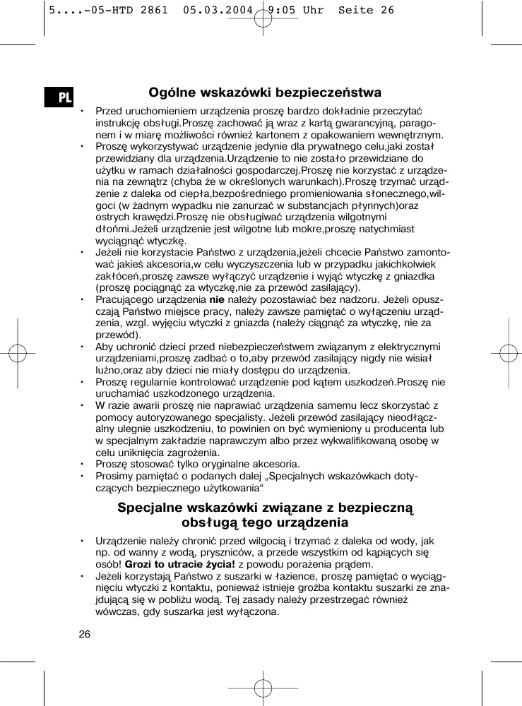- Ježeli korzystaja Państwo z suszcari właziance, prosze pamietac o wyciagnieci wtyczki z kontaku, poniewaz astnieje grożba kontaku suszcari ze znajdujacja sie w robizu woda. Tejzasady nalezy przechstręgać rownikówoczas, gdy suszcara jest wy)—zona.
