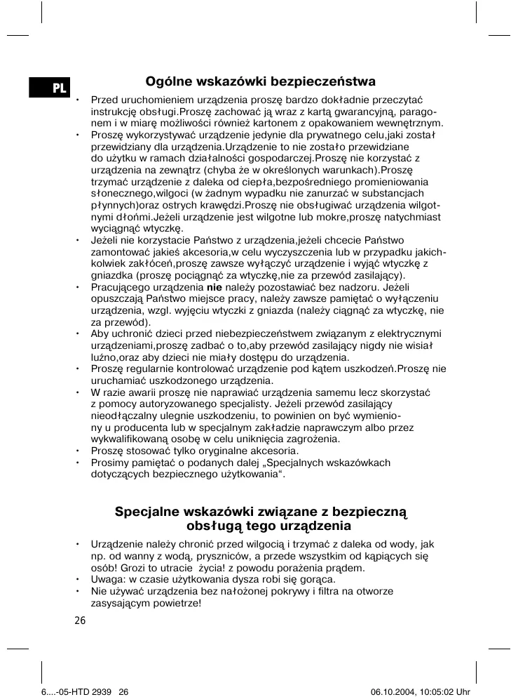 Urządzenie należy chronić przed wilgocią i trzymać z daleka od wody, jak np. od wanny z wodą, pryszniców, a przede wszystkim od kąpiących się osób! Grozi to utracie życia! z powodu porażenia prądem. Uwaga: w czasie użytkowania dysza robi się gorąca. Nie używać urządzenia bez nałożonej pokrywy i filtra na otworze zasysającym powietrze!