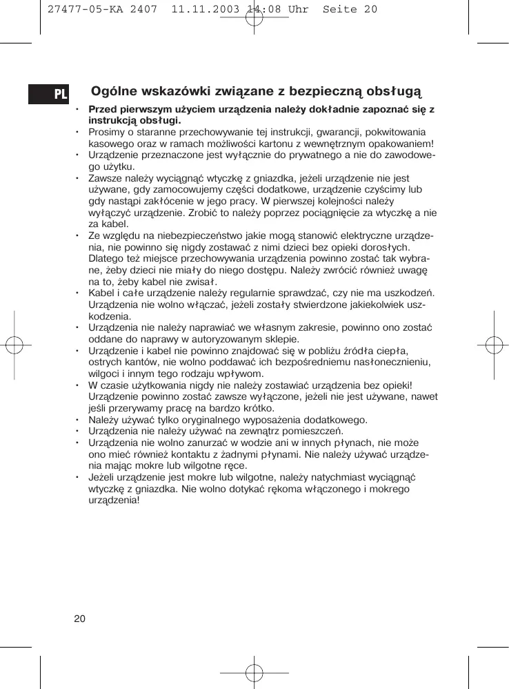 • Przed pierwszym użyciem urządzenia należy dokładnie zapoznać się z instrukcją obsługi. • Prosimy o staranne przechowywanie tej instrukcji, gwarancji, pokwitowania kasowego oraz w ramach możliwości kartonu z wewnętrznym opakowaniem! • Urządzenie przeznaczone jest wyłącznie do prywatnego a nie do zawodowego użytku. • Zawsze należy wyciągnąć wtyczkę z gniazdka, jeżeli urządzenie nie jest używane, gdy zamocowujemy części dodatkowe, urządzenie czyścimy lub gdy nastąpi zakłócenie w jego pracy. W pierwszej kolejności należy wyłączyć urządzenie. Zrobić to należy poprzez pociągnięcie za wtyczkę a nie za kabel. • Ze względu na niebezpieczeństwo jakie mogą stanowić elektryczne urządzenia, nie powinno się nigdy zostawać z nimi dzieci bez opieki dorosłych. Dlatego też miejsce przechowywania urządzenia powinno zostać tak wybrane, żeby dzieci nie miały do niego dostępu. Należy zwrócić również uwagę na to, żeby kabel nie zwisał. • Kabel i całe urządzenie należy regularnie sprawdzać, czy nie ma uszkodzeń. Urządzenia nie wolno włączać, jeżeli zostały stwierdzone jakiekolwiek uszkodzenia. • Urządzenia nie należy naprawiać we własnym zakresie, powinno ono zostać oddane do naprawy w autoryzowanym sklepie. • Urządzenie i kabel nie powinno znajdować się w pobliżu źródła ciepła, ostrych kantów, nie wolno poddawać ich bezpośredniemu nasłonecznieniu, wilgoci i innym tego rodzaju wpływom. • W czasie użytkowania nigdy nie należy zostawiać urządzenia bez opieki! Urządzenie powinno zostać zawsze wyłączone, jeżeli nie jest używane, nawet jeśli przerywamy pracę na bardzo krótko. • Należy używać tylko oryginalnego wyposażenia dodatkowego. • Urządzenia nie należy używać na zewnątrz pomieszczeń. • Urządzenia nie wolno zanurzać w wodzie ani w innych płynach, nie może ono mieć również kontaktu z żadnymi płynami. Nie należy używać urządzenia mając mokre lub wilgotne ręce. • Jeżeli urządzenie jest mokre lub wilgotne, należy natychmiast wyciągnąć wtyczkę z gniazdka. Nie wolno dotykać rękoma włączonego i mokrego urządzenia!