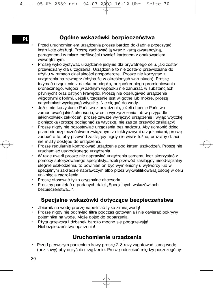 Uruchomienie urządzenia • Przed pierwszym parzeniem kawy proszę 2-3 razy zagotować samą wodę (bez kawy) aby oczyścić urządzenie. Proszę odczekać między poszczególny30