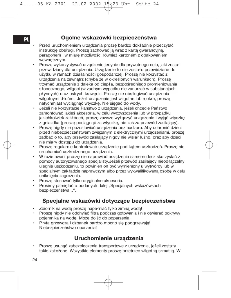 Przed uruchomieniem urządzenia proszę bardzo dokładnie przeczytać instrukcję obsługi. Proszę zachować ją wraz z kartą gwarancyjną, paragonem i w miarę możliwości również kartonem z opakowaniem wewnętrznym. Proszę wykorzystywać urządzenie jedynie dla prywatnego celu, jaki został przewidziany dla urządzenia. Urządzenie to nie zostało przewidziane do użytku w ramach działalności gospodarczej. Proszę nie korzystać z urządzenia na zewnątrz (chyba że w określonych warunkach). Proszę trzymać urządzenie z daleka od ciepła, bezpośredniego promieniowania słonecznego, wilgoci (w żadnym wypadku nie zanurzać w substancjach płynnych) oraz ostrych krawędzi. Proszę nie obsługiwać urządzenia wilgotnymi dłońmi. Jeżeli urządzenie jest wilgotne lub mokre, proszę natychmiast wyciągnąć wtyczkę. Nie sięgać do wody. Jeżeli nie korzystacie Państwo z urządzenia, jeżeli chcecie Państwo zamontować jakieś akcesoria, w celu wyczyszczenia lub w przypadku jakichkolwiek zakłóceń, proszę zawsze wyłączyć urządzenie i wyjąć wtyczkę z gniazdka (proszę pociągnąć za wtyczkę, nie zaś za przewód zasilający). Proszę nigdy nie pozostawiać urządzenia bez nadzoru. Aby uchronić dzieci przed niebezpieczeństwem związanym z elektrycznymi urządzeniami, proszę zadbać o to, aby przewód zasilający nigdy nie wisiał luźno, oraz aby dzieci nie miały dostępu do urządzenia. Proszę regularnie kontrolować urządzenie pod kątem uszkodzeń. Proszę nie uruchamiać uszkodzonego urządzenia. W razie awarii proszę nie naprawiać urządzenia samemu lecz skorzystać z pomocy autoryzowanego specjalisty.Jeżeli przewód zasilający nieodłączalny ulegnie uszkodzeniu, to powinien on być wymieniony u wytwórcy lub w specjalnym zakładzie naprawczym albo przez wykwalifikowaną osobę w celu uniknięcia zagrożenia. Proszę stosować tylko oryginalne akcesoria. Prosimy pamiętać o podanych dalej „Specjalnych wskazówkach bezpieczeństwa...“.