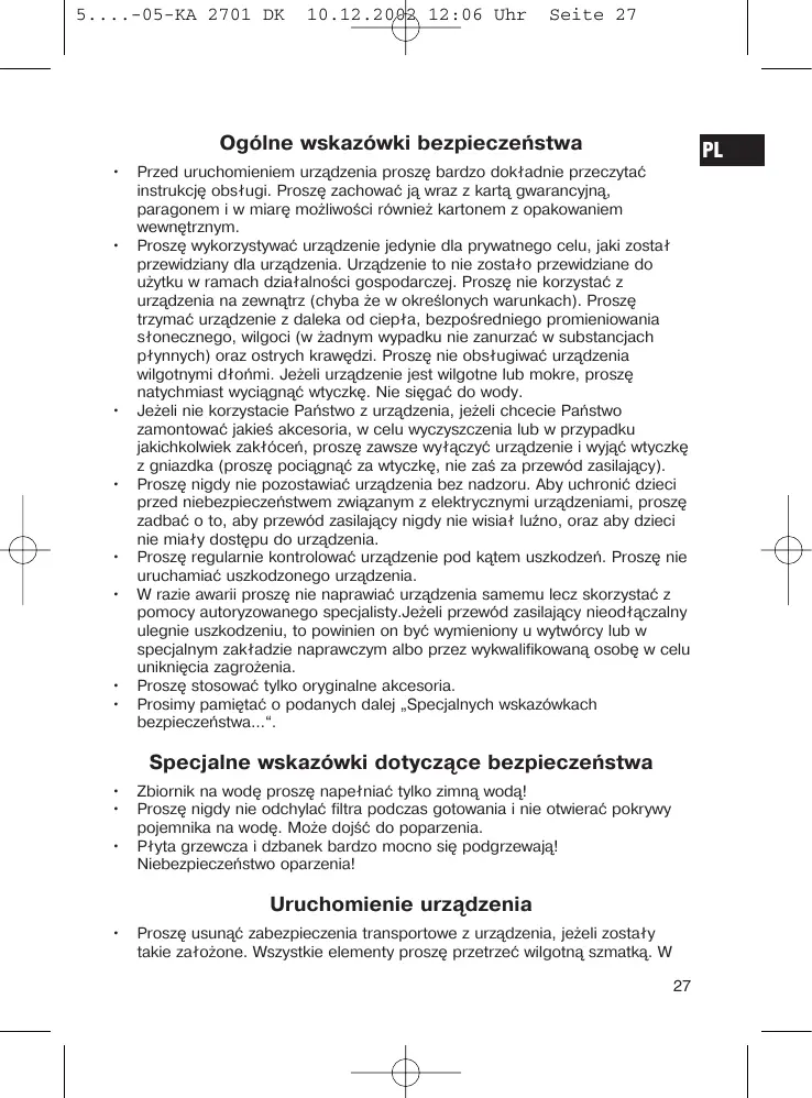 PL Przed uruchomieniem urządzenia proszę bardzo dokładnie przeczytać instrukcję obsługi. Proszę zachować ją wraz z kartą gwarancyjną, paragonem i w miarę możliwości również kartonem z opakowaniem wewnętrznym. Proszę wykorzystywać urządzenie jedynie dla prywatnego celu, jaki został przewidziany dla urządzenia. Urządzenie to nie zostało przewidziane do użytku w ramach działalności gospodarczej. Proszę nie korzystać z urządzenia na zewnątrz (chyba że w określonych warunkach). Proszę trzymać urządzenie z daleka od ciepła, bezpośredniego promieniowania słonecznego, wilgoci (w żadnym wypadku nie zanurzać w substancjach płynnych) oraz ostrych krawędzi. Proszę nie obsługiwać urządzenia wilgotnymi dłońmi. Jeżeli urządzenie jest wilgotne lub mokre, proszę natychmiast wyciągnąć wtyczkę. Nie sięgać do wody. Jeżeli nie korzystacie Państwo z urządzenia, jeżeli chcecie Państwo zamontować jakieś akcesoria, w celu wyczyszczenia lub w przypadku jakichkolwiek zakłóceń, proszę zawsze wyłączyć urządzenie i wyjąć wtyczkę z gniazdka (proszę pociągnąć za wtyczkę, nie zaś za przewód zasilający). Proszę nigdy nie pozostawiać urządzenia bez nadzoru. Aby uchronić dzieci przed niebezpieczeństwem związanym z elektrycznymi urządzeniami, proszę zadbać o to, aby przewód zasilający nigdy nie wisiał luźno, oraz aby dzieci nie miały dostępu do urządzenia. Proszę regularnie kontrolować urządzenie pod kątem uszkodzeń. Proszę nie uruchamiać uszkodzonego urządzenia. W razie awarii proszę nie naprawiać urządzenia samemu lecz skorzystać z pomocy autoryzowanego specjalisty.Jeżeli przewód zasilający nieodłączalny ulegnie uszkodzeniu, to powinien on być wymieniony u wytwórcy lub w specjalnym zakładzie naprawczym albo przez wykwalifikowaną osobę w celu uniknięcia zagrożenia. Proszę stosować tylko oryginalne akcesoria. Prosimy pamiętać o podanych dalej „Specjalnych wskazówkach bezpieczeństwa...“.