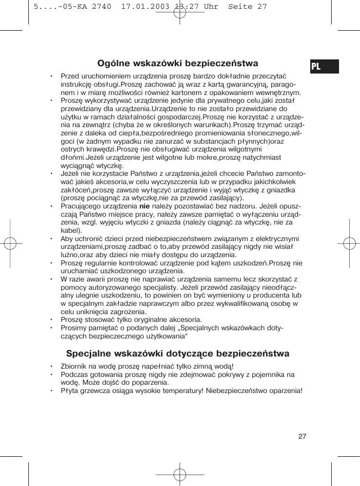 PL Przed uruchomieniem urządzenia proszę bardzo dokładnie przeczytać instrukcję obsługi.Proszę zachować ją wraz z kartą gwarancyjną, paragonem i w miarę możliwości również kartonem z opakowaniem wewnętrznym. Proszę wykorzystywać urządzenie jedynie dla prywatnego celu,jaki został przewidziany dla urządzenia.Urządzenie to nie zostało przewidziane do użytku w ramach działalności gospodarczej.Proszę nie korzystać z urządzenia na zewnątrz (chyba że w określonych warunkach).Proszę trzymać urządzenie z daleka od ciepła,bezpośredniego promieniowania słonecznego,wilgoci (w żadnym wypadku nie zanurzać w substancjach płynnych)oraz ostrych krawędzi.Proszę nie obsługiwać urządzenia wilgotnymi dłońmi.Jeżeli urządzenie jest wilgotne lub mokre,proszę natychmiast wyciągnąć wtyczkę. Jeżeli nie korzystacie Państwo z urządzenia,jeżeli chcecie Państwo zamontować jakieś akcesoria,w celu wyczyszczenia lub w przypadku jakichkolwiek zakłóceń,proszę zawsze wyłączyć urządzenie i wyjąć wtyczkę z gniazdka (proszę pociągnąć za wtyczkę,nie za przewód zasilający). Pracującego urządzenia nie należy pozostawiać bez nadzoru. Jeżeli opuszczają Państwo miejsce pracy, należy zawsze pamiętać o wyłączeniu urządzenia, wzgl. wyjęciu wtyczki z gniazda (należy ciągnąć za wtyczkę, nie za kabel). Aby uchronić dzieci przed niebezpieczeństwem związanym z elektrycznymi urządzeniami,proszę zadbać o to,aby przewód zasilający nigdy nie wisiał luźno,oraz aby dzieci nie miały dostępu do urządzenia. Proszę regularnie kontrolować urządzenie pod kątem uszkodzeń.Proszę nie uruchamiać uszkodzonego urządzenia. W razie awarii proszę nie naprawiać urządzenia samemu lecz skorzystać z pomocy autoryzowanego specjalisty. Jeżeli przewód zasilający nieodłączalny ulegnie uszkodzeniu, to powinien on być wymieniony u producenta lub w specjalnym zakładzie naprawczym albo przez wykwalifikowaną osobę w celu uniknięcia zagrożenia. Proszę stosować tylko oryginalne akcesoria. Prosimy pamiętać o podanych dalej „Specjalnych wskazówkach dotyczących bezpieczecznego użytkowania“