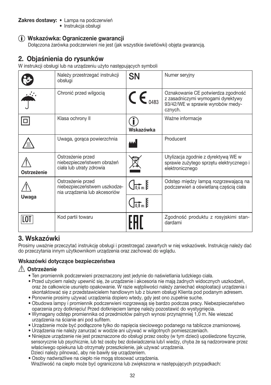 • Ten promiennik podczerwieni przeznaczony jest jedynie do naświetlania ludzkiego ciała. • Przed użyciem należy upewnić się, że urządzenie i akcesoria nie mają żadnych widocznych uszkodzeń, oraz że całkowicie usunięto opakowanie. W razie wątpliwości należy zaniechać eksploatacji urządzenia i skontaktować się z przedstawicielem handlowym lub z biurem obsługi Klienta pod podanym adresem. • Ponownie prosimy używać urządzenia dopiero wtedy, gdy jest ono zupełnie suche. • Obudowa lampy i promiennik podczerwieni rozgrzewają się bardzo podczas pracy. Niebezpieczeństwo oparzenia przy dotknięciu! Przed dotknięciem lampę należy pozostawić do wystygnięcia. • Wymagany odstęp promiennika od przedmiotów palnych wynosi przynajmniej 1,0 m. Nie wieszać urządzenia na ścianie ani pod sufitem. • Urządzenie może być podłączone tylko do napięcia sieciowego podanego na tabliczce znamionowej. • Urządzenia nie należy zanurzać w wodzie ani używać w wilgotnych pomieszczeniach. • Niniejsze urządzenie nie jest przeznaczone do obsługi przez osoby (w tym dzieci) upośledzone fizycznie, sensorycznie lub psychicznie, lub też osoby bez doświadczenia lub/i wiedzy, chyba że są nadzorowane przez właściwego opiekuna lub otrzymały przeszkolenie, jak używać urządzenia. Dzieci należy pilnować, aby nie bawiły się urządzeniem. • Osoby nadwrażliwe na ciepło nie mogą stosować urządzenia. Wrażliwość na ciepło może być ograniczona lub zwiększona w następujących przypadkach: 32