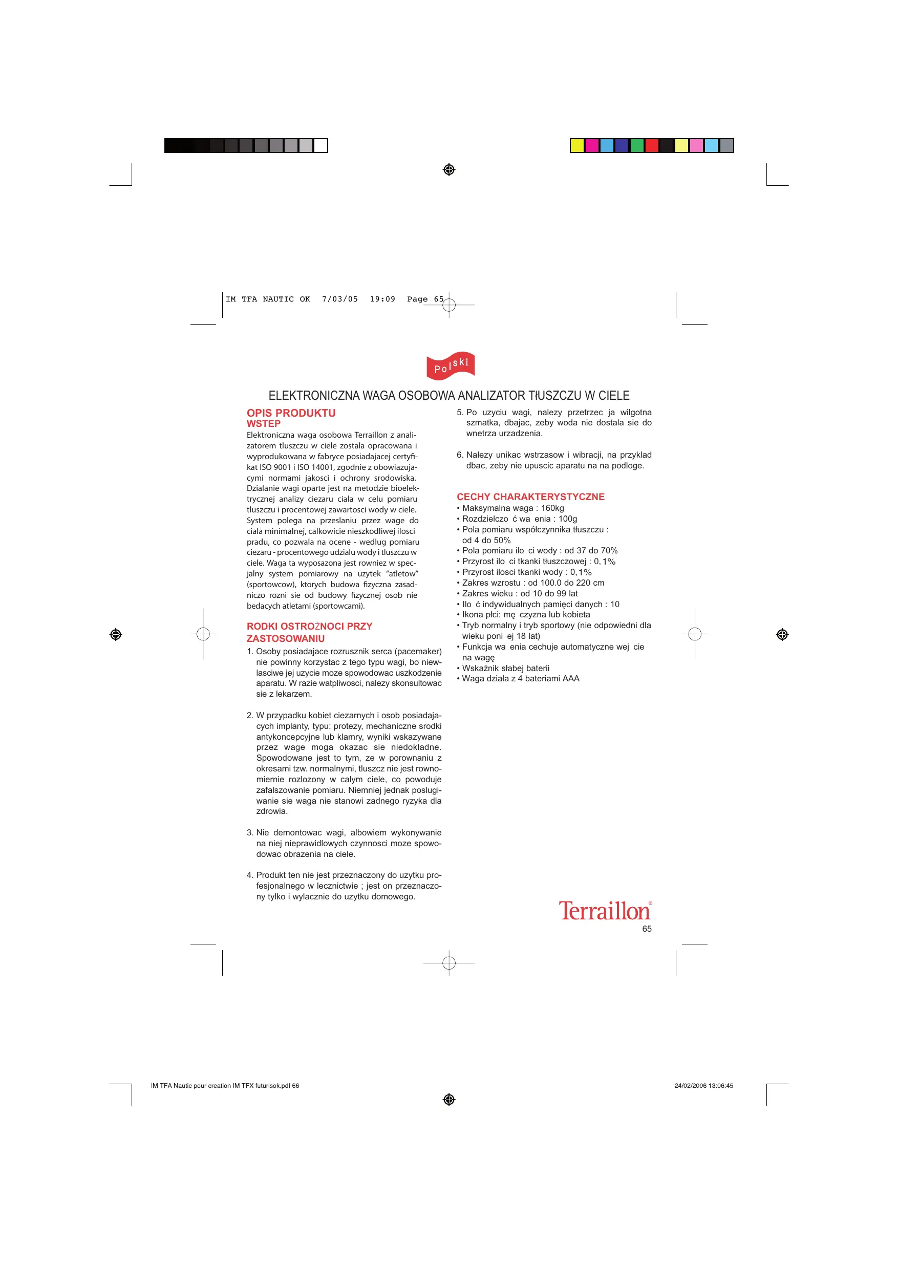 ELEKTRONICZNA WAGA OSOBOWA ANALIZATOR TłUSZCZU W CIELE OPIS PRODUKTU WSTEP Elektroniczna waga osobowa Terraillon z analizatorem tluszczu w ciele zostala opracowana i wyprodukowana w fabryce posiadajacej certyfikat ISO 9001 i ISO 14001, zgodnie z obowiazujacymi normami jakosci i ochrony srodowiska. Dzialanie wagi oparte jest na metodzie bioelektrycznej analizy ciezaru ciala w celu pomiaru tluszczu i procentowej zawartosci wody w ciele. System polega na przeslaniu przez wage do ciala minimalnej, calkowicie nieszkodliwej ilosci pradu, co pozwala na ocene - wedlug pomiaru ciezaru - procentowego udzialu wody i tluszczu w ciele. Waga ta wyposazona jest rowniez w specjalny system pomiarowy na uzytek “atletow” (sportowcow), ktorych budowa fizyczna zasadniczo rozni sie od budowy fizycznej osob nie bedacych atletami (sportowcami).
