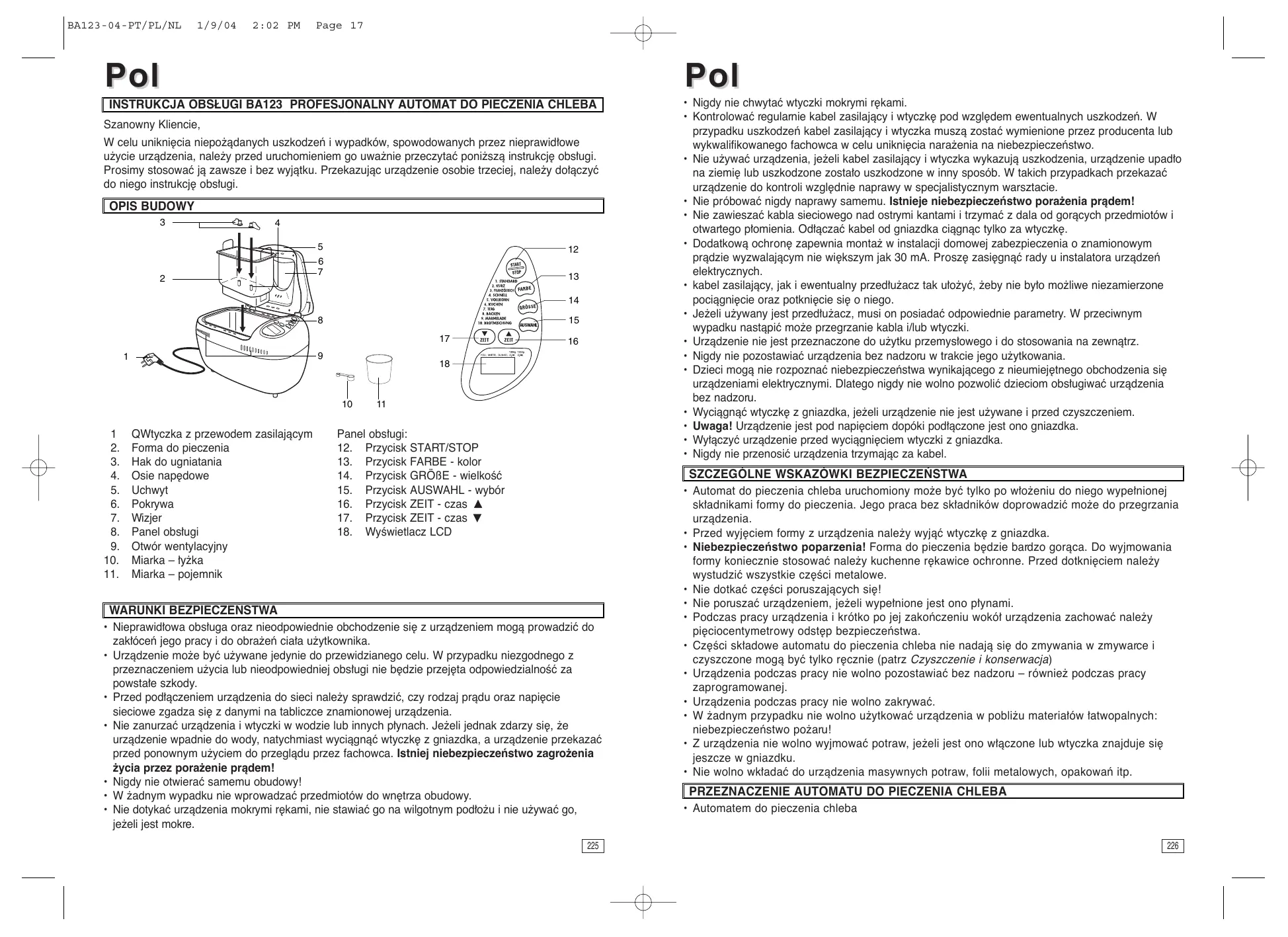 BA123-04-PT/PL/NL 1/9/04 2:02 PM Page 17 Pol Pol INSTRUKCJA OBSâUGI BA23 PROFESJONALNY AUTOMAT DO PIECZENIA CHLEBA Szanowny Kliencie, W celu uniknicia niepo×àdanych uszkodzeƒ i wypadków, spowodowanych przez nieprawidãowe u×ycie urzàdzenia, nale×y przed uruchomieniem go uwa×nie przeczytaþ poni×szà instrukcj obsãugi. Prosimy stosowaþ jà zawsze i bez wyjàtku. Przekazujàc urzàdzenie osobie trzeciej, nale×y doãàczyþ do niego instrukcj obsãugi. OPIS BUDOWY