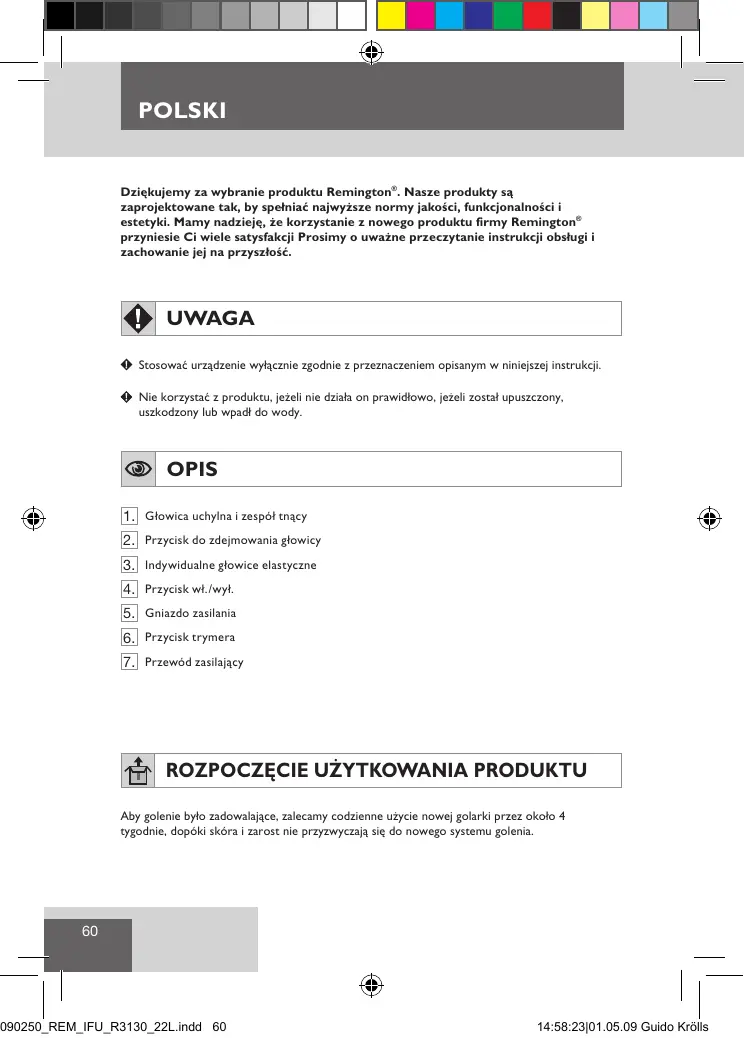 14:58:23|01.05.09 Guido Krölls polski Dziękujemy za wybranie produktu Remington®. Nasze produkty są zaprojektowane tak, by spełniać najwyższe normy jakości, funkcjonalności i estetyki. Mamy nadzieję, że korzystanie z nowego produktu firmy Remington® przyniesie Ci wiele satysfakcji Prosimy o uważne przeczytanie instrukcji obsługi i zachowanie jej na przyszłość. UWAGA Stosować urządzenie wyłącznie zgodnie z przeznaczeniem opisanym w niniejszej instrukcji. ie korzystać z produktu, jeżeli nie działa on prawidłowo, jeżeli został upuszczony, uszkodzony lub wpadł do wody. OPIS