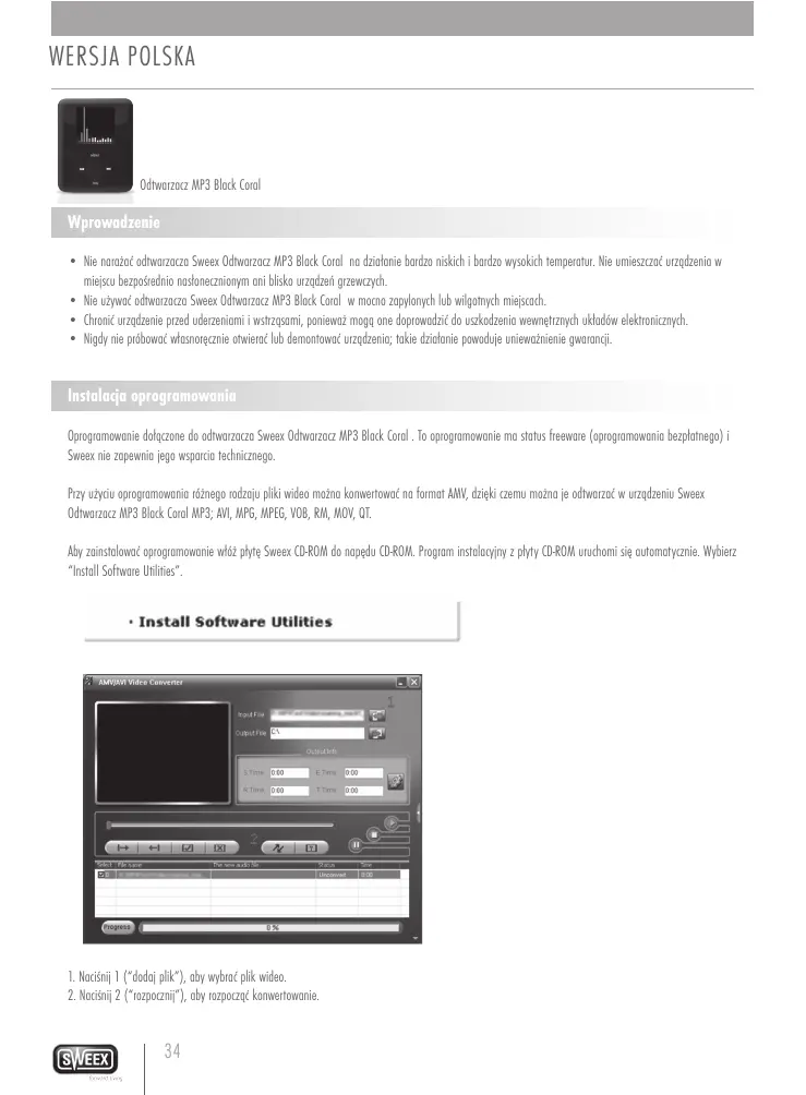 - Nigdy nie próbować własnoręcznie otwierać lub demontować urządzenia; takie działanie powoduje unieważnienie gwarancji. Instalacja oprogramowania Oprogramowanie dołączone do odtwarzacza Sweex Odtwarzacz MP3 Black Coral . To oprogramowanie ma status freeware (oprogramowania bezpłatnego) i Sweex nie zapewnia jego wsparcia technicznego. Przy użyciu oprogramowania różnego rodzaju pliki wideo można konwertować na format AMV, dzięki czemu można je odtwarzać w urządzeniu Sweex Odtwarzacz MP3 Black Coral MP3; AVI, MPG, MPEG, VOB, RM, MOV, QT. Aby zainstalować oprogramowanie włóż płytę Sweex CD-ROM do napędu CD-ROM. Program instalacyjny z płyty CD-ROM uruchomi się automatycznie. Wybierz “Install Software Utilities”.