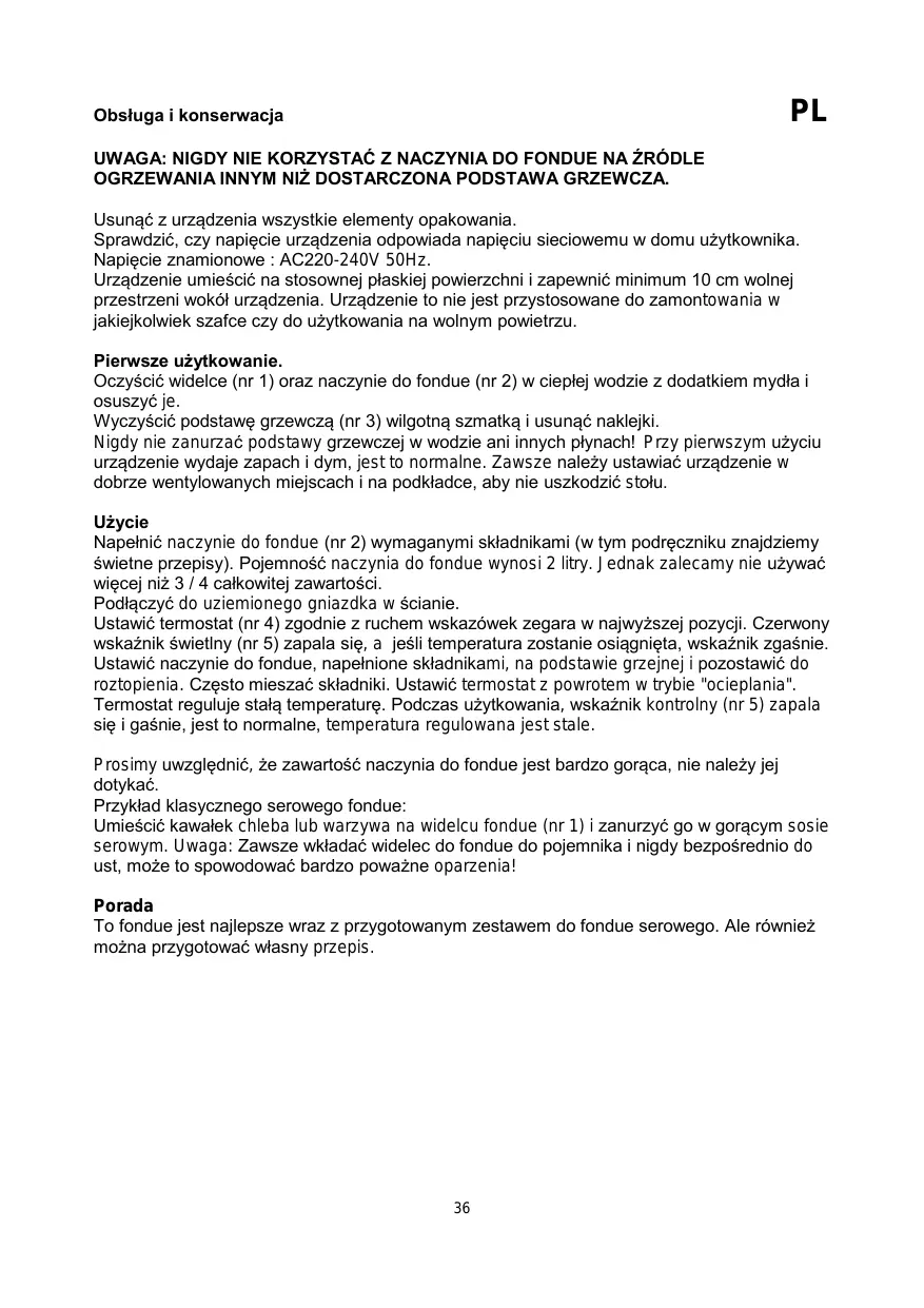 Wyczyscic podstawe grzejna (nr 3) wilgotna szmatka. W razie koniecznosci- detergentem. Nigdy nie uzywać szorstkich ani zracych sądków do czyszczenia, stalowej wěły ani czyscików do szorowania, jak,ź moga uzskodzic urzadzenia. Nie wóladyć urzadzenia do wody ani inniej cieczny. Przetrzymać naczynie do fondue (nr 2) w ciepiej wodzie i usṇȩ pozostaluść szczeoteczka do mycia naczyń. WidelceNSEJy umyC wciepiej wodzie z dodatkiem mylá lub w zmywarce do naczyń. Naczyna do fondue (nr 2) nie wolno myc w zmywarce.