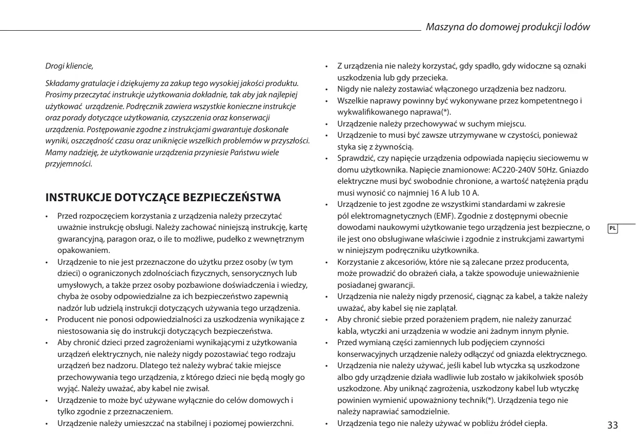 Firma Tristar nie jest odpowiedzialna za uszkodzenia powstałe w wyniku: o upadku urządzenia, o technicznej modyfikacji urządzenia dokonanej przez właściciela lub inną osobę, o niewłaściwego użytkowania urządzenia, o normalnego zużywania się urządzenia. Przeprowadzenie napraw nie przedłuża oryginalnego 24-miesięcznego okresu gwarancyjnego ani nie upoważnia do uzyskania nowej gwarancji. Gwarancja ta jest wiążąca prawnie tylko na terenie Europy. Gwarancja ta nie unieważnia wytycznych dyrektywy europejskiej 1944/44CE. Należy pamiętać o zachowaniu paragonu; bez paragonu nie można składać żadnych roszczeń gwarancyjnych. Uszkodzenia spowodowane niestosowaniem się do instrukcji obsługi spowodują unieważnienie gwarancji, a za powstałe w wyniku tego uszkodzenia firma Tristar nie będzie ponosić odpowiedzialności. Maszyna do domowej produkcji lodów